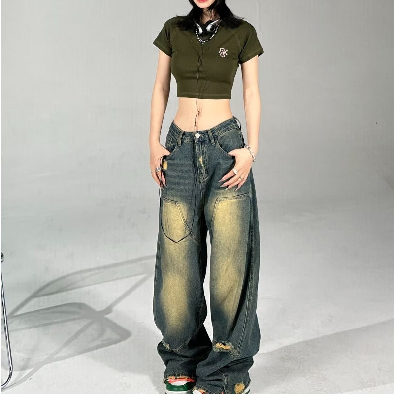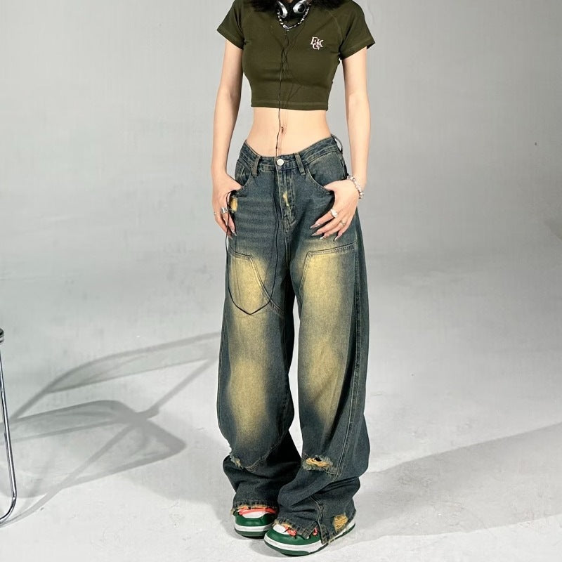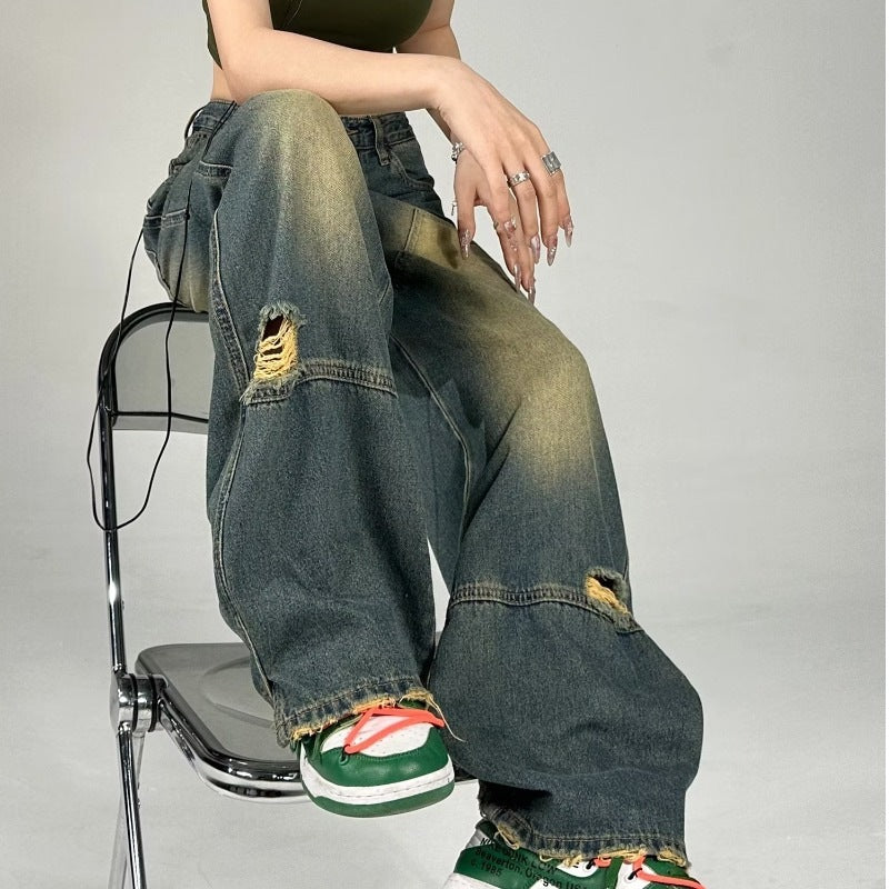Jean de style américain High Street Hip Hop à larges trous, teint en jaune et couleur contrastée