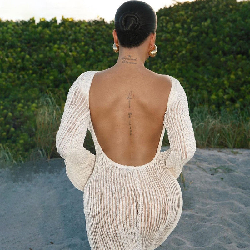 Robe dos nu moulante en tissu texturé, idéale pour l'automne