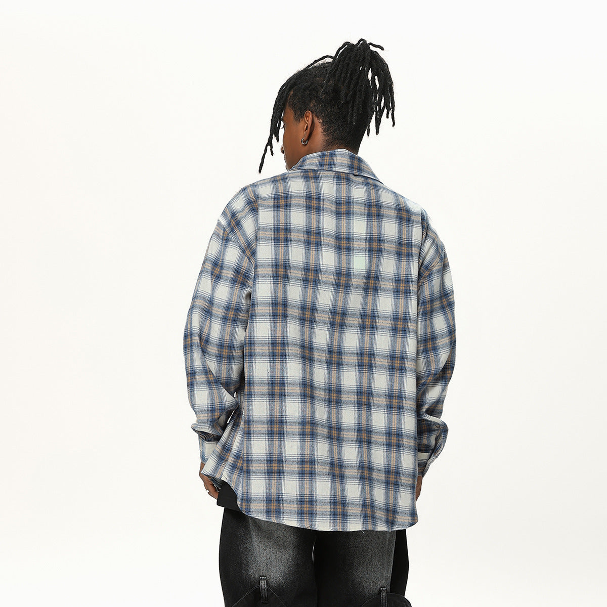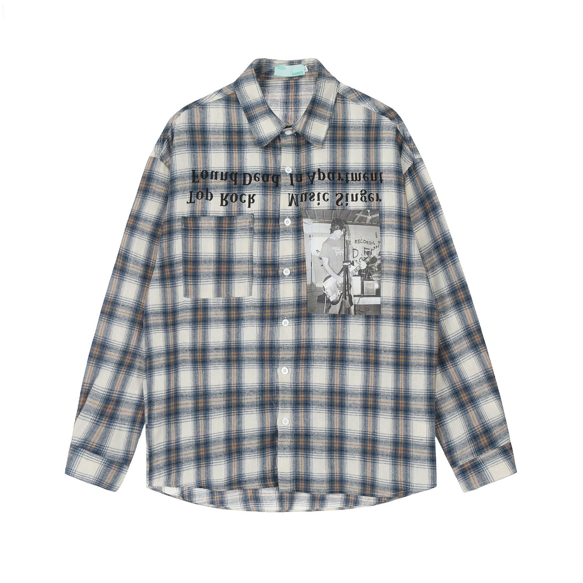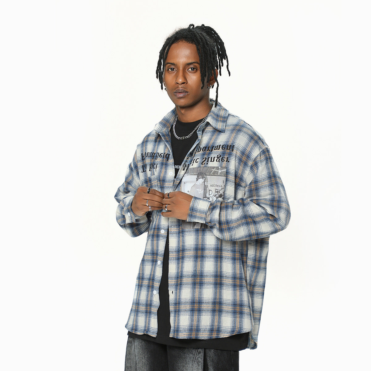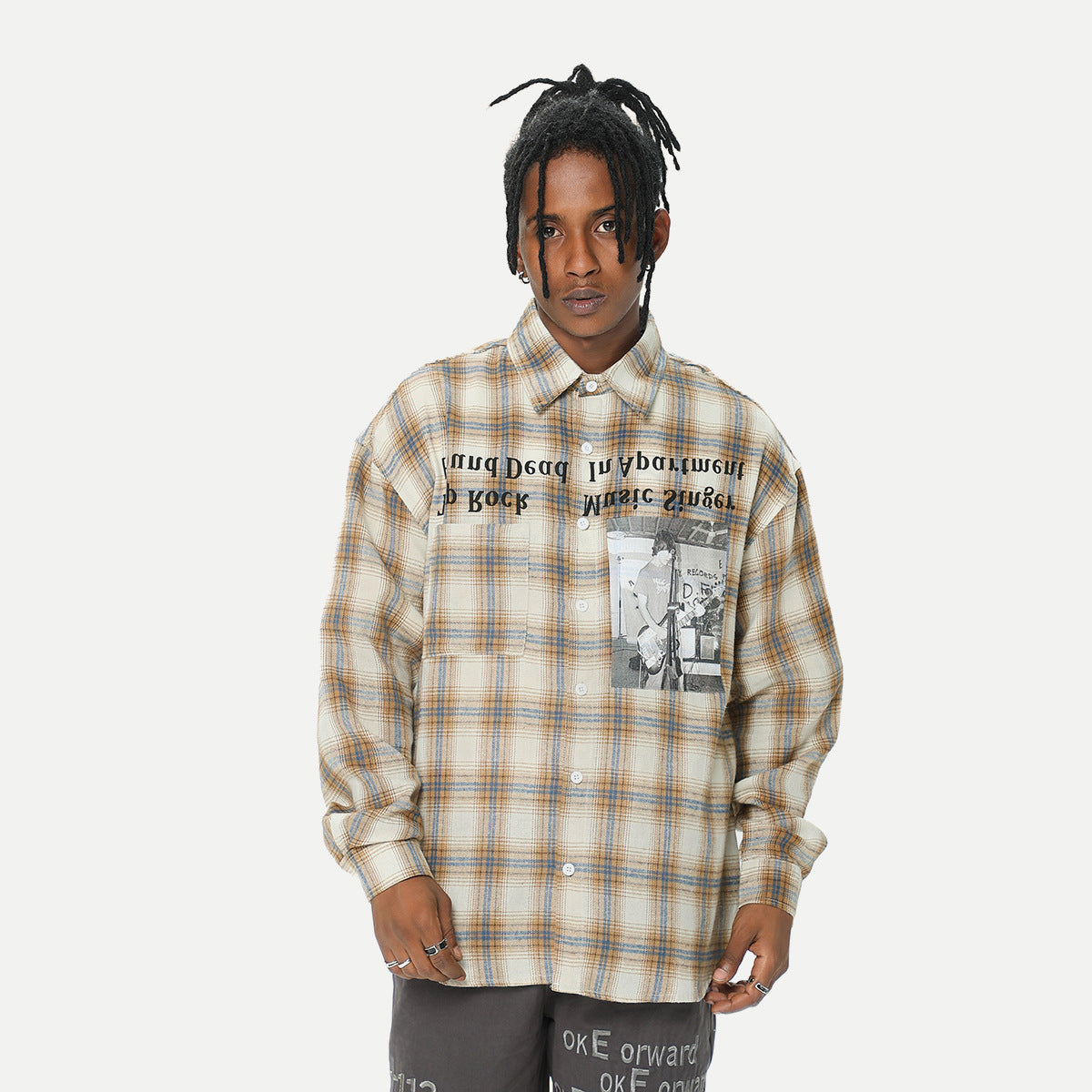 Chemise à carreaux à manches longues et col montant, imprimé lettres de caractère, marque de mode