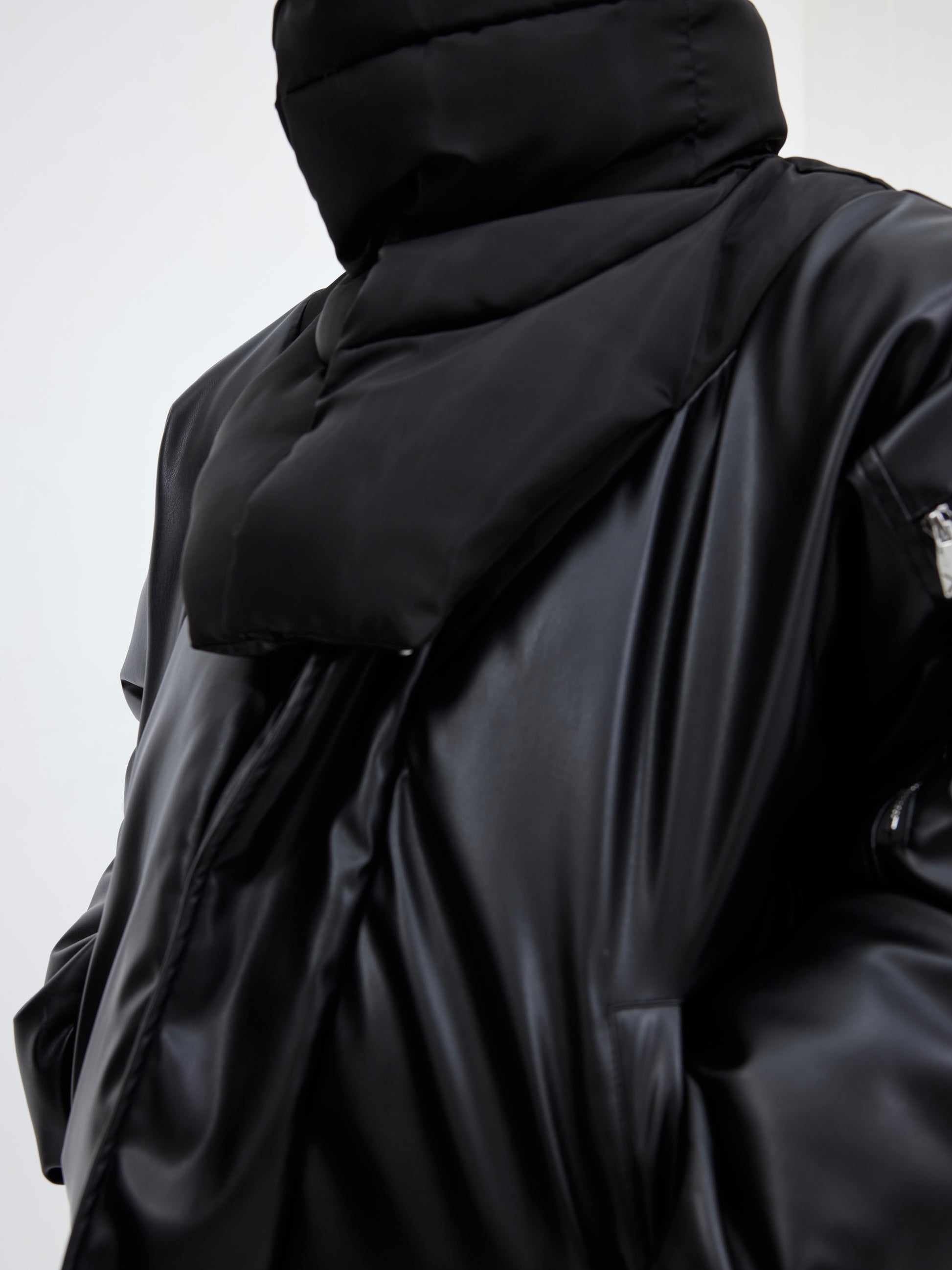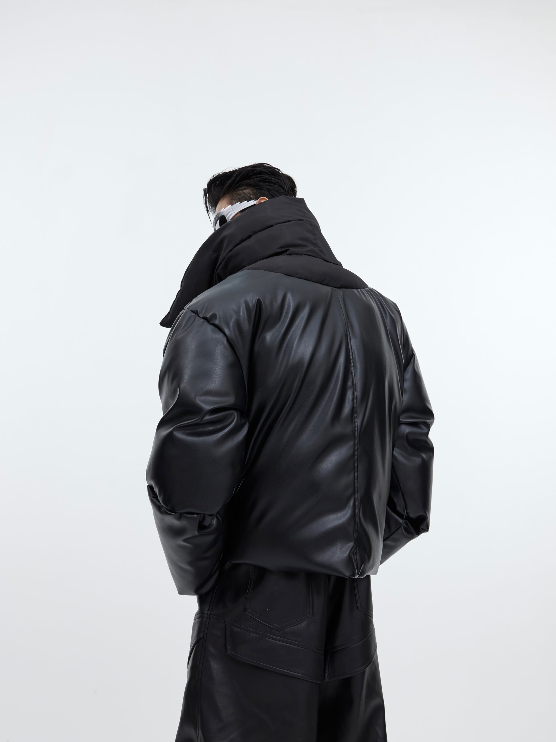 Manteau en coton à double col, veste en cuir PU brillant, surpiqûres, manteau rembourré en coton épaissi.