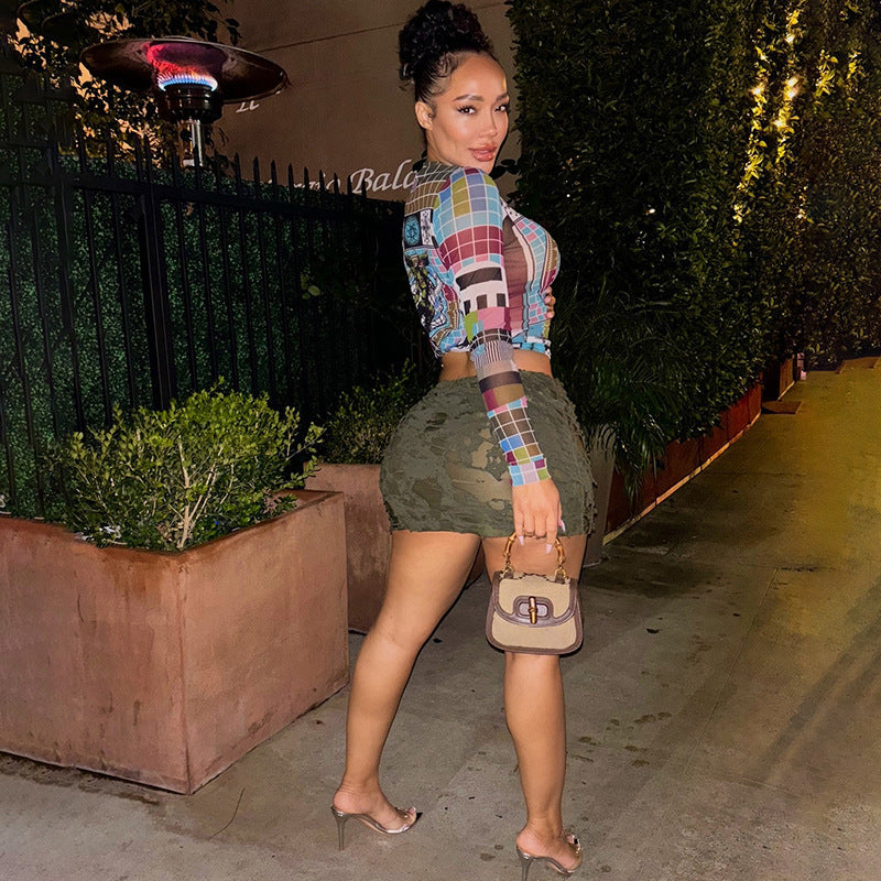 Haut moulant à manches longues et col rond, dévoilant le ventre, pour femme