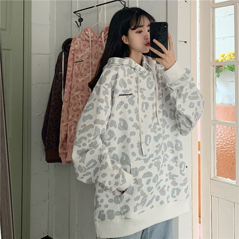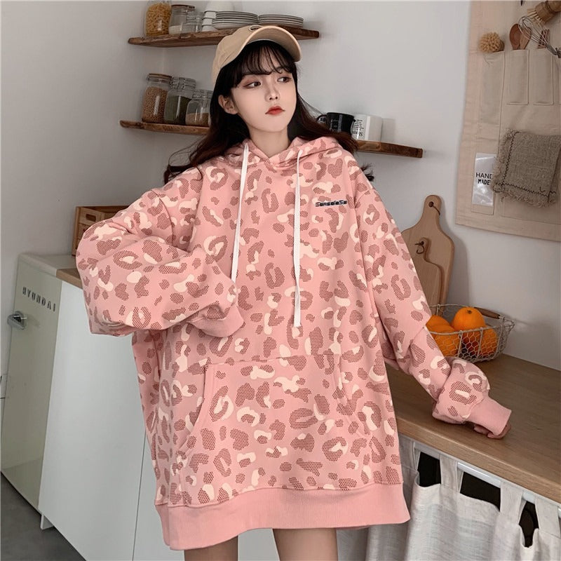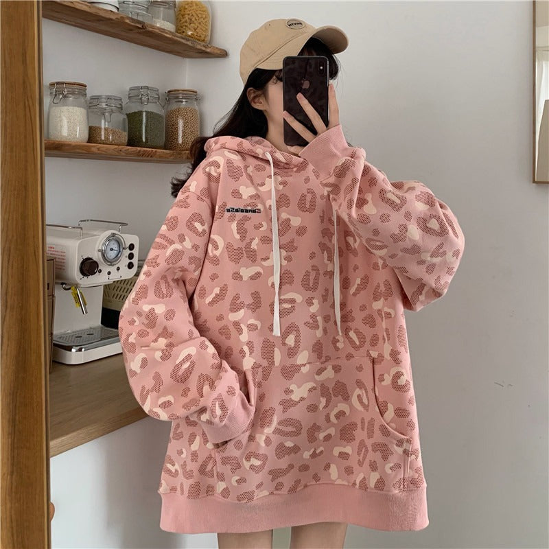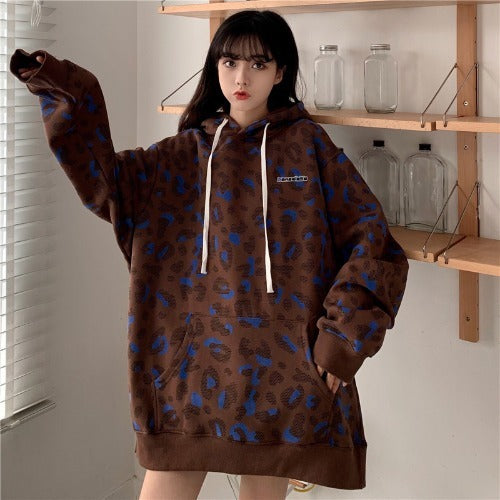 Pull à imprimé léopard style Fried Street Loose Couple Plus Sweat à capuche rembourré en velours