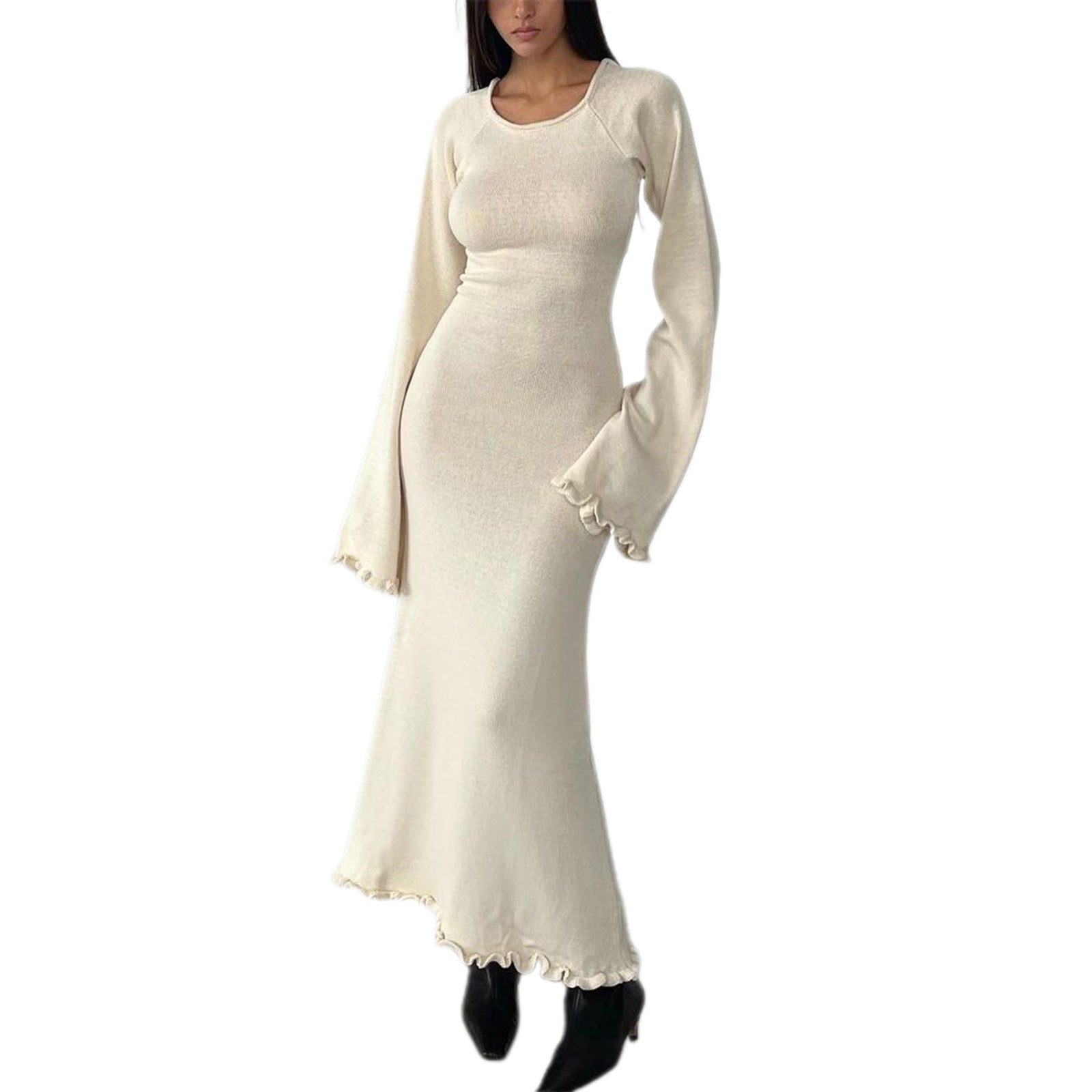 Nouvelle robe longue en tricot à dos nu et à lisière filiforme de couleur unie