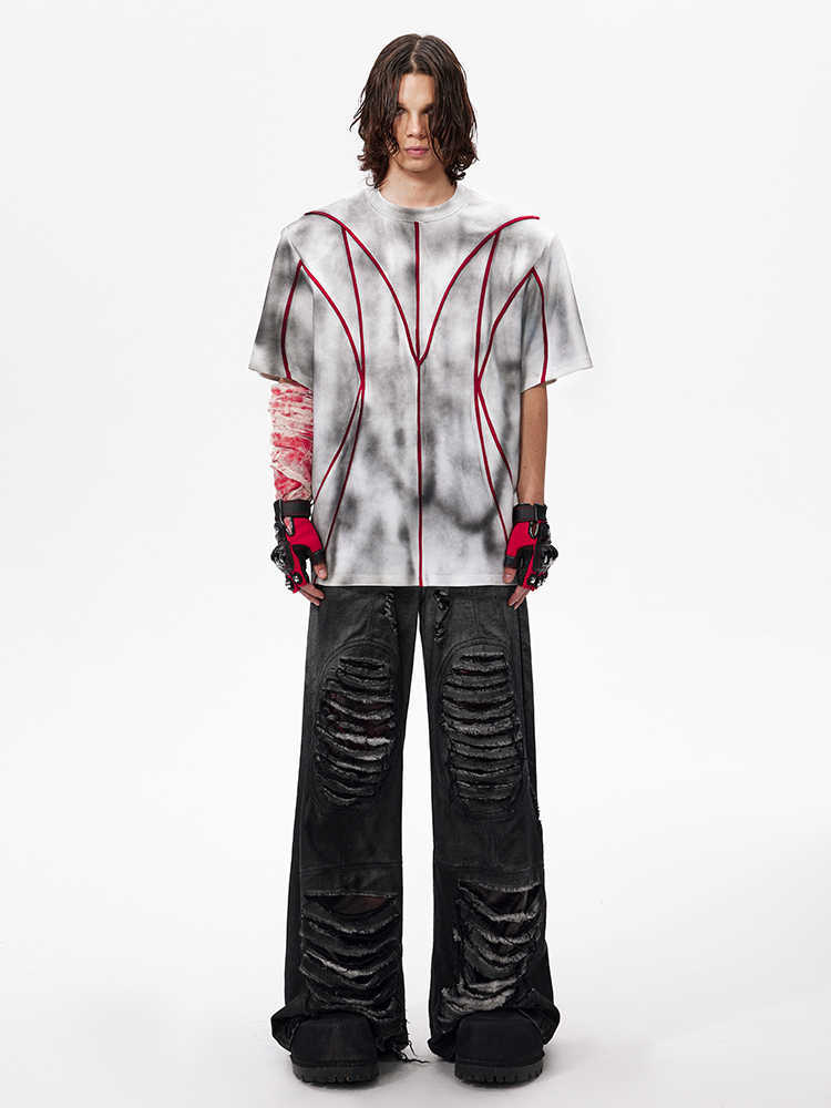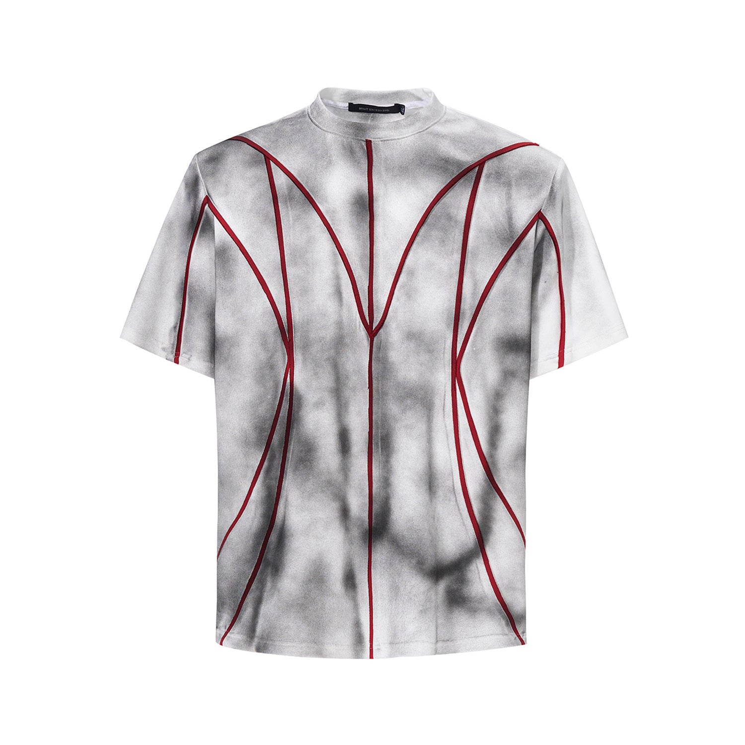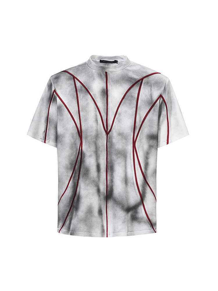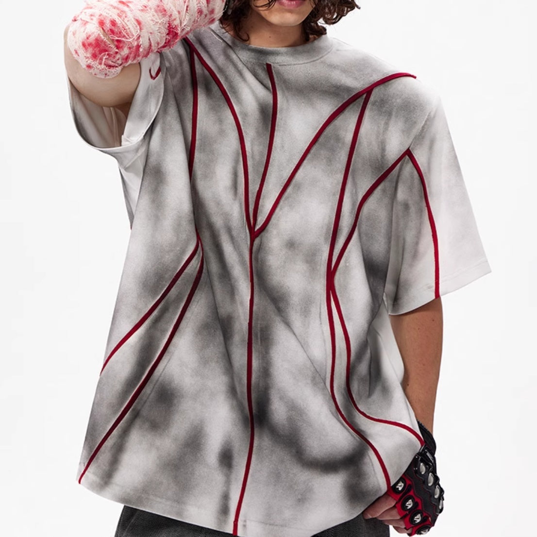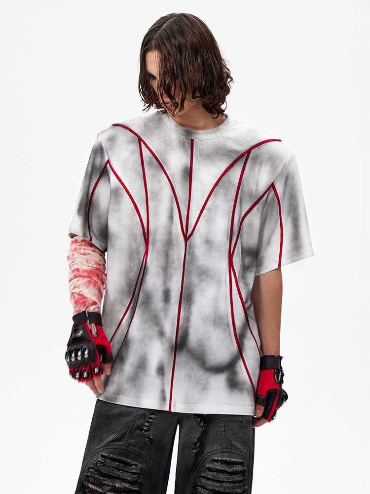 T-shirt à manches courtes et épaules rembourrées, col rond, patchwork tridimensionnel