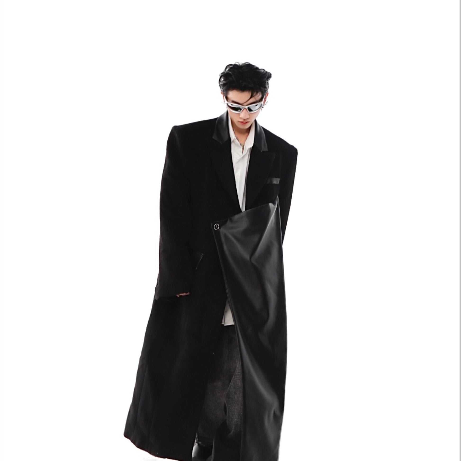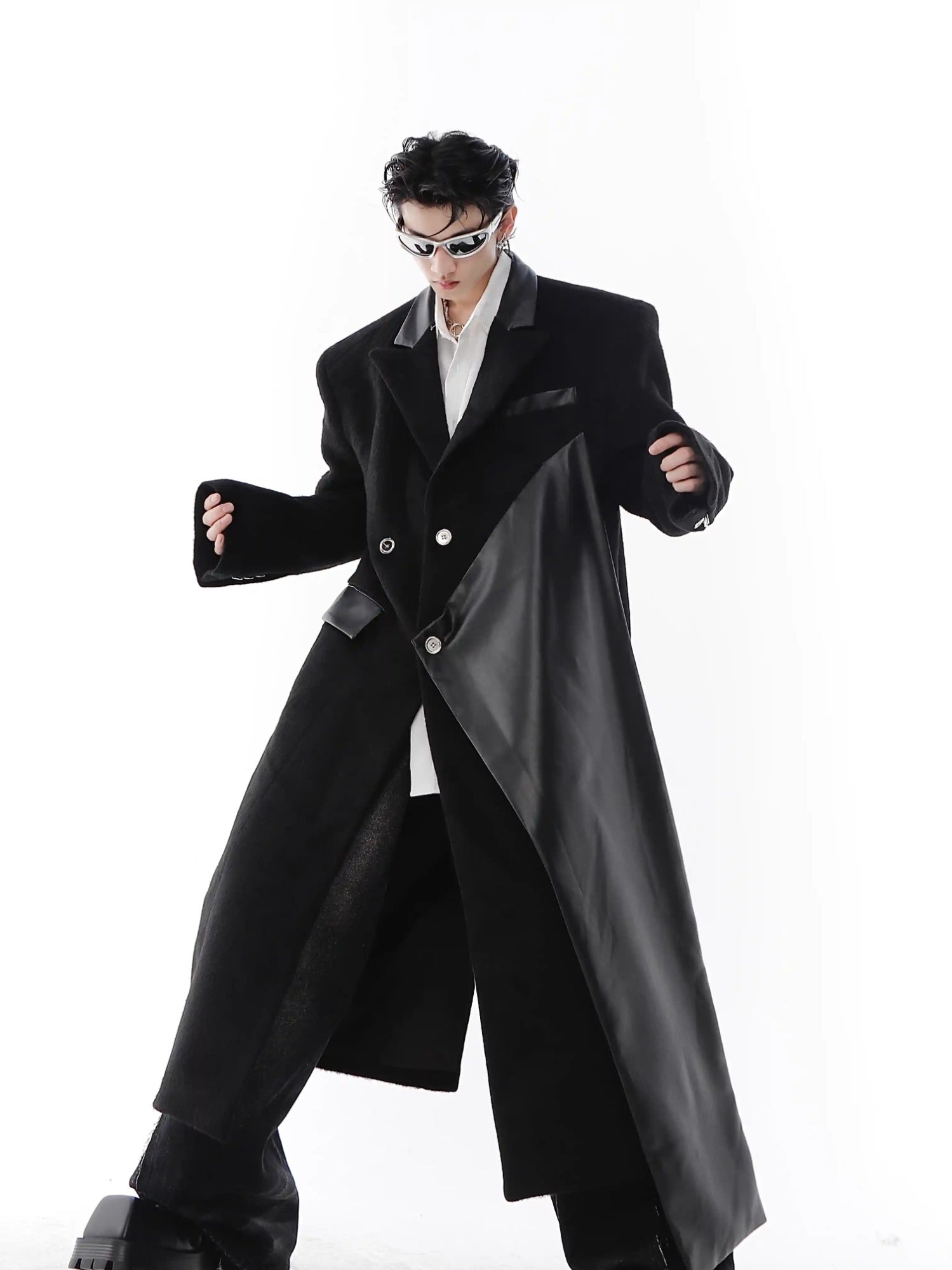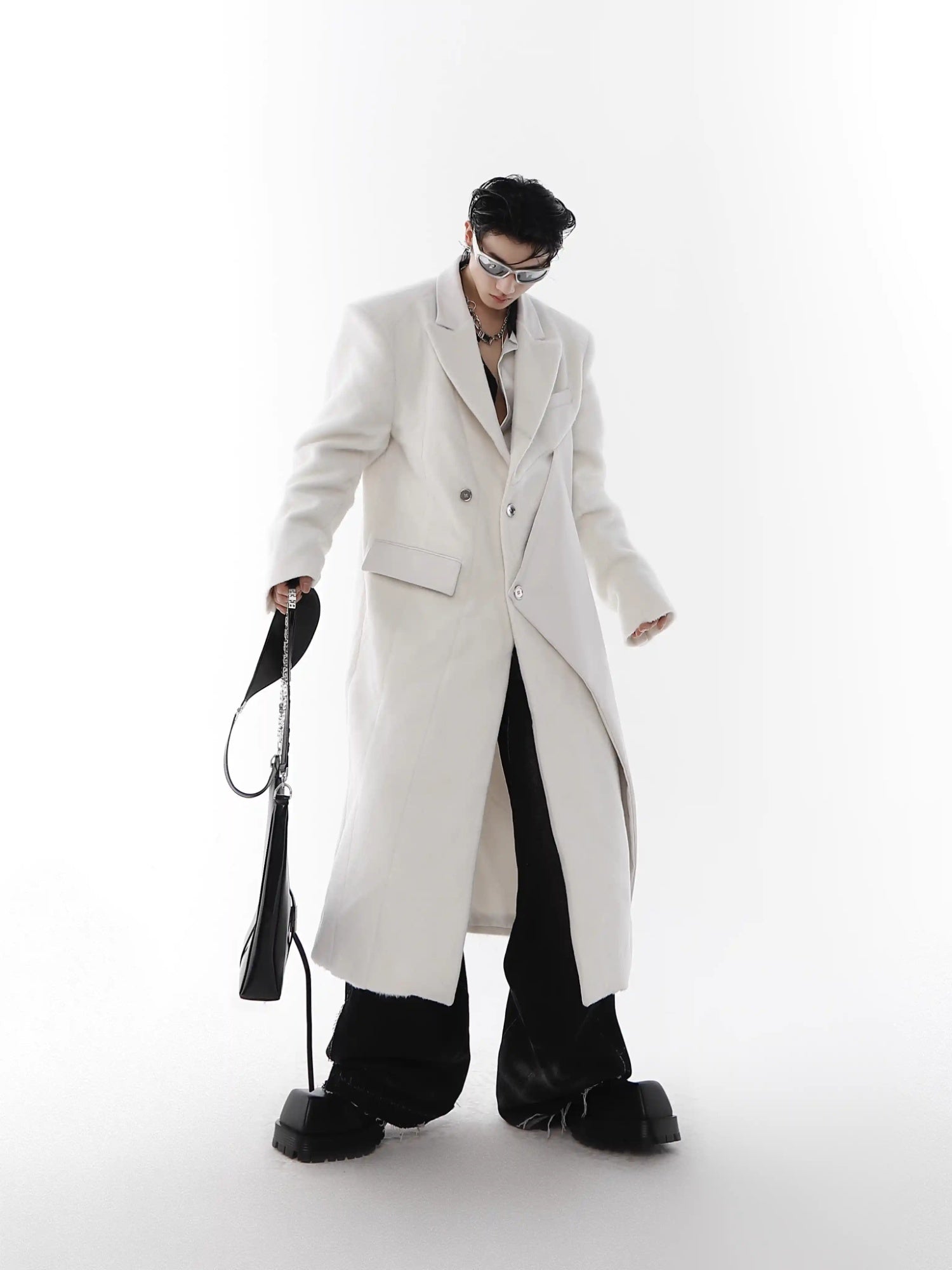 Manteau en laine à épaules rembourrées et coutures en cuir synthétique, long trench-coat blanc au-dessus du genou