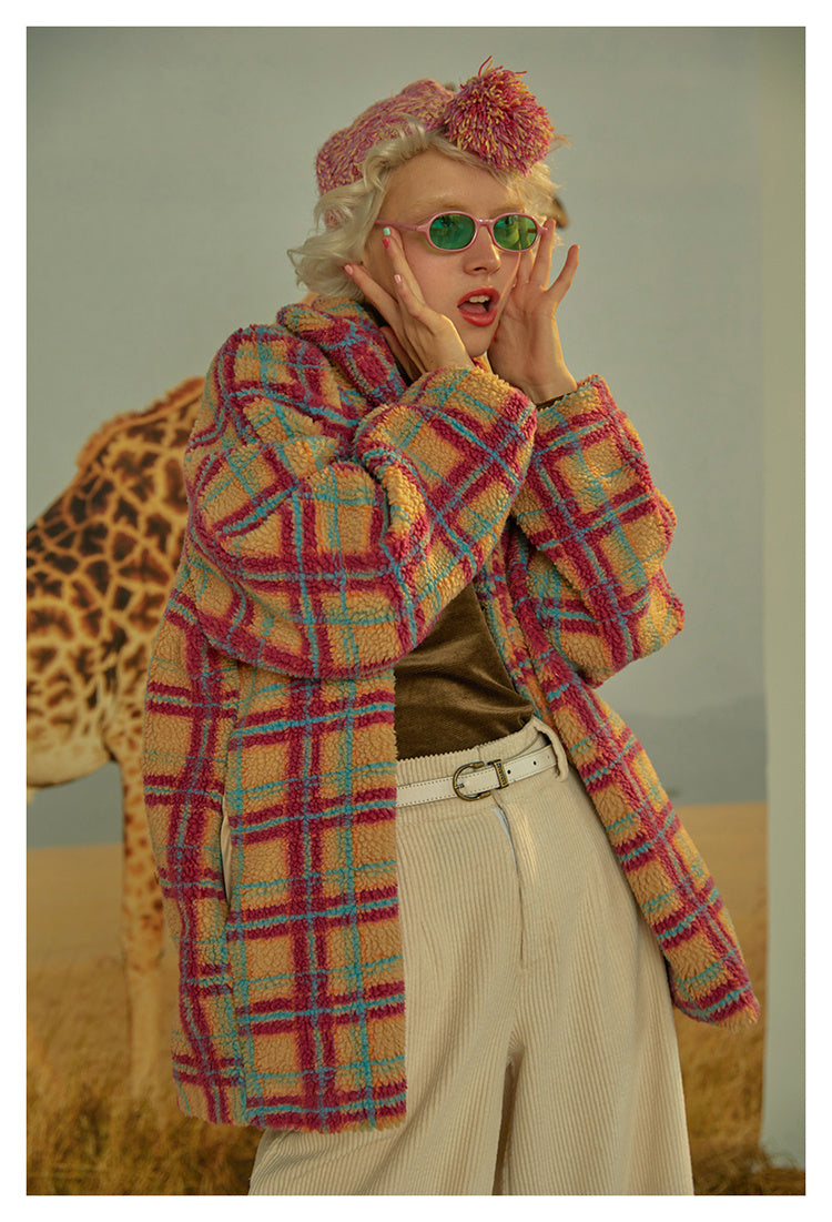 Manteau silhouette à manches longues et revers en cuir d'agneau à carreaux