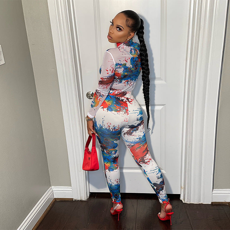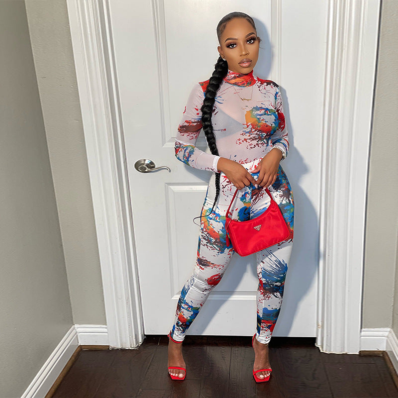 Ensemble décontracté à col roulé imprimé et manches longues, pantalon skinny taille haute