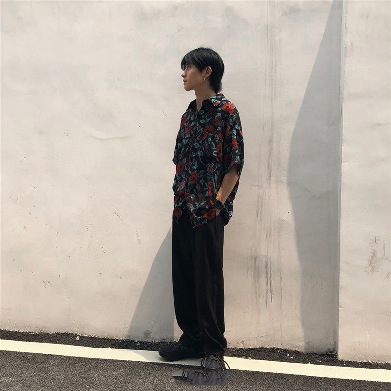 Chemise à manches courtes rétro, chemise ample décontractée à fleurs