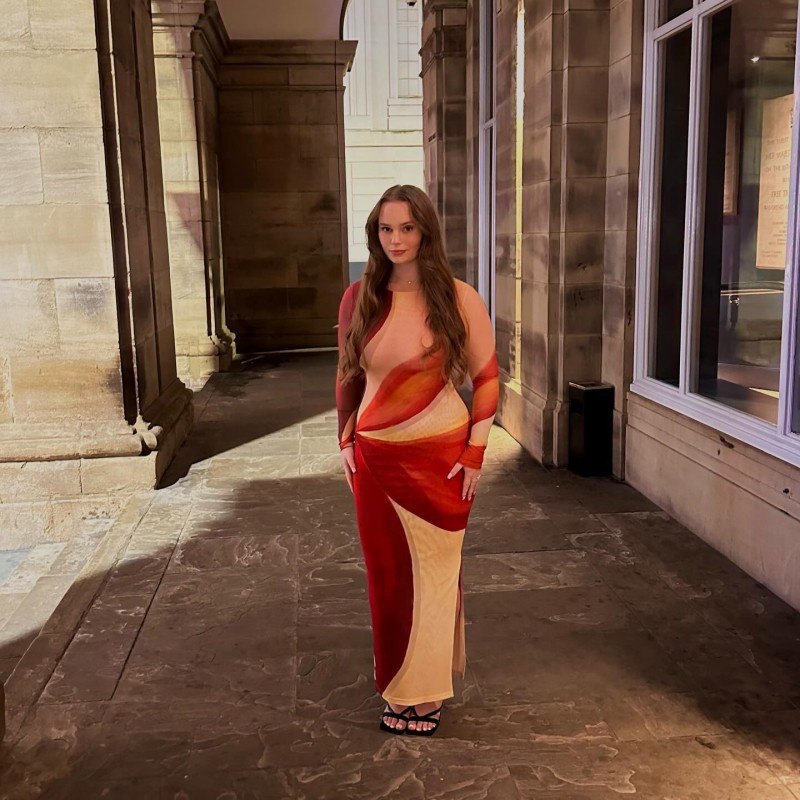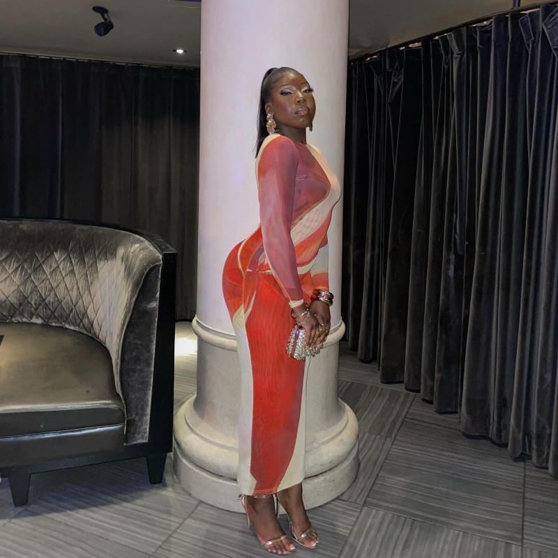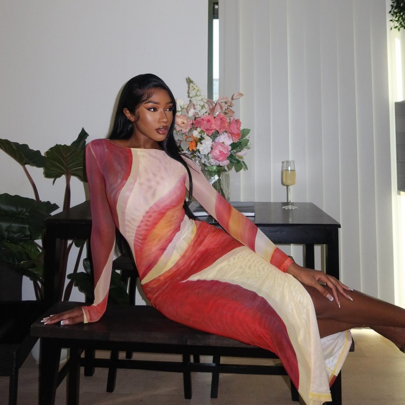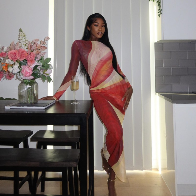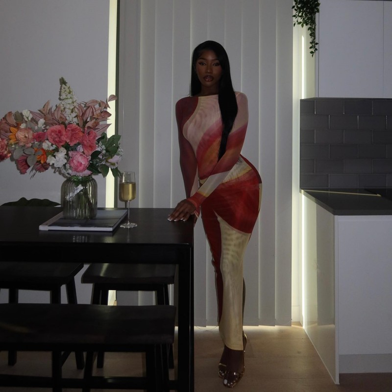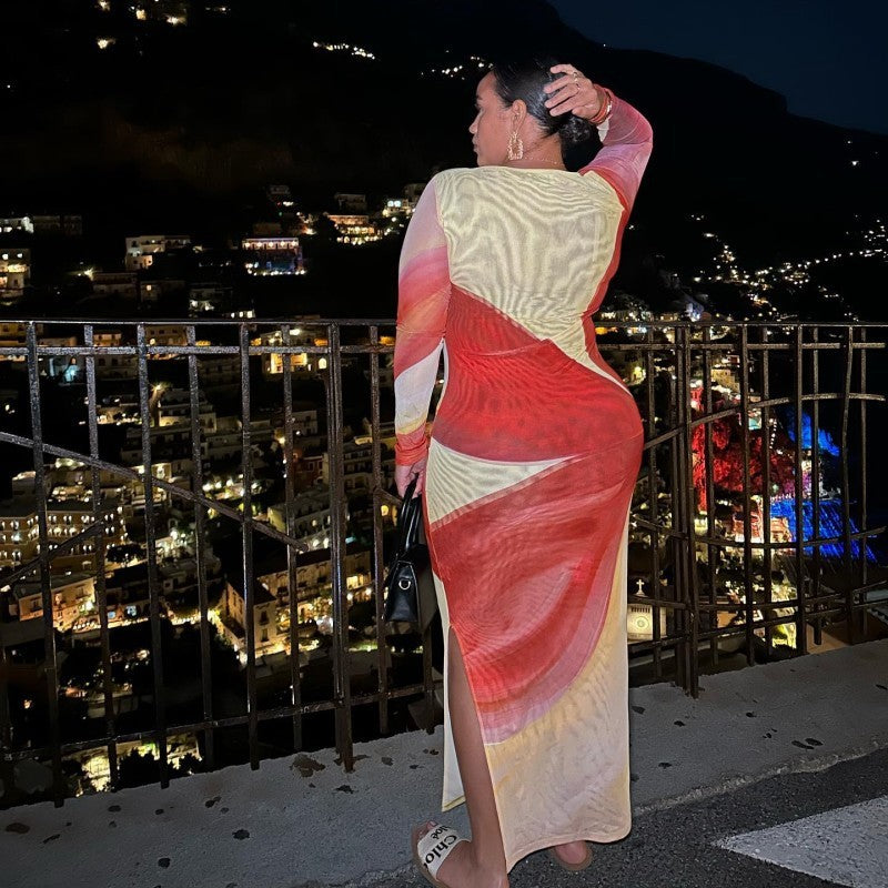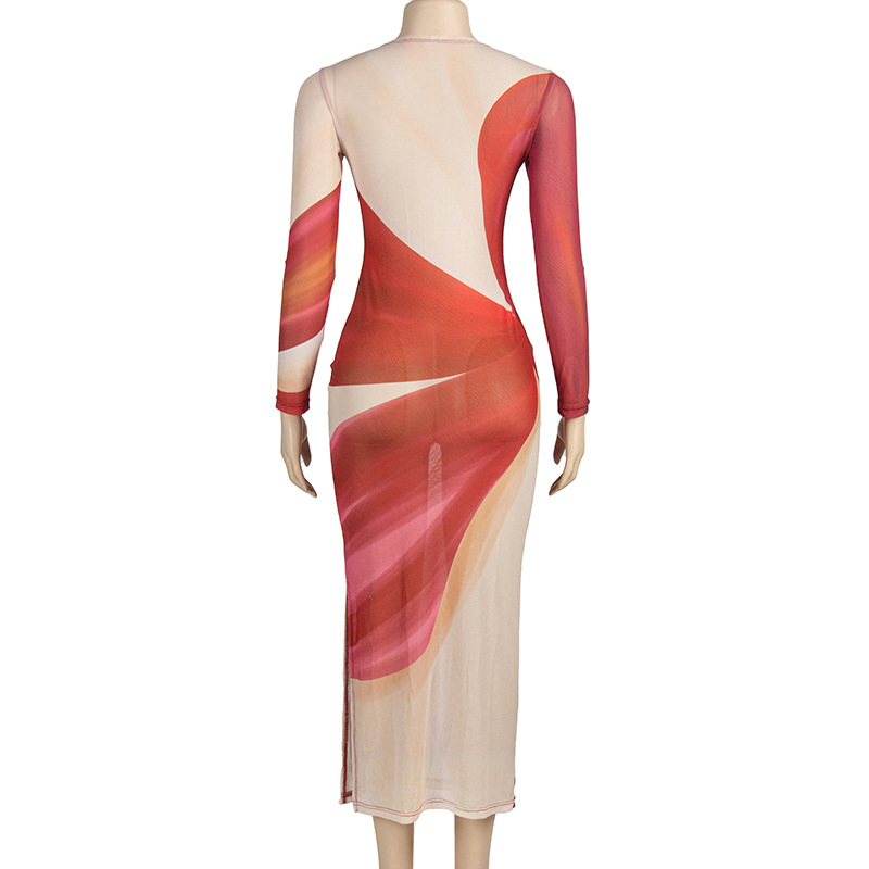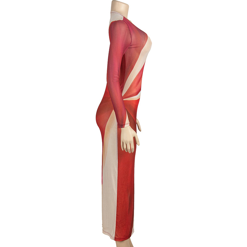 Robe longue ajustée à col rond et manches longues en maille à imprimé floral
