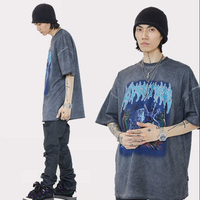 T-shirt ample à manches courtes et imprimé rock délavé pour homme, nouveauté printemps-été, National Tide