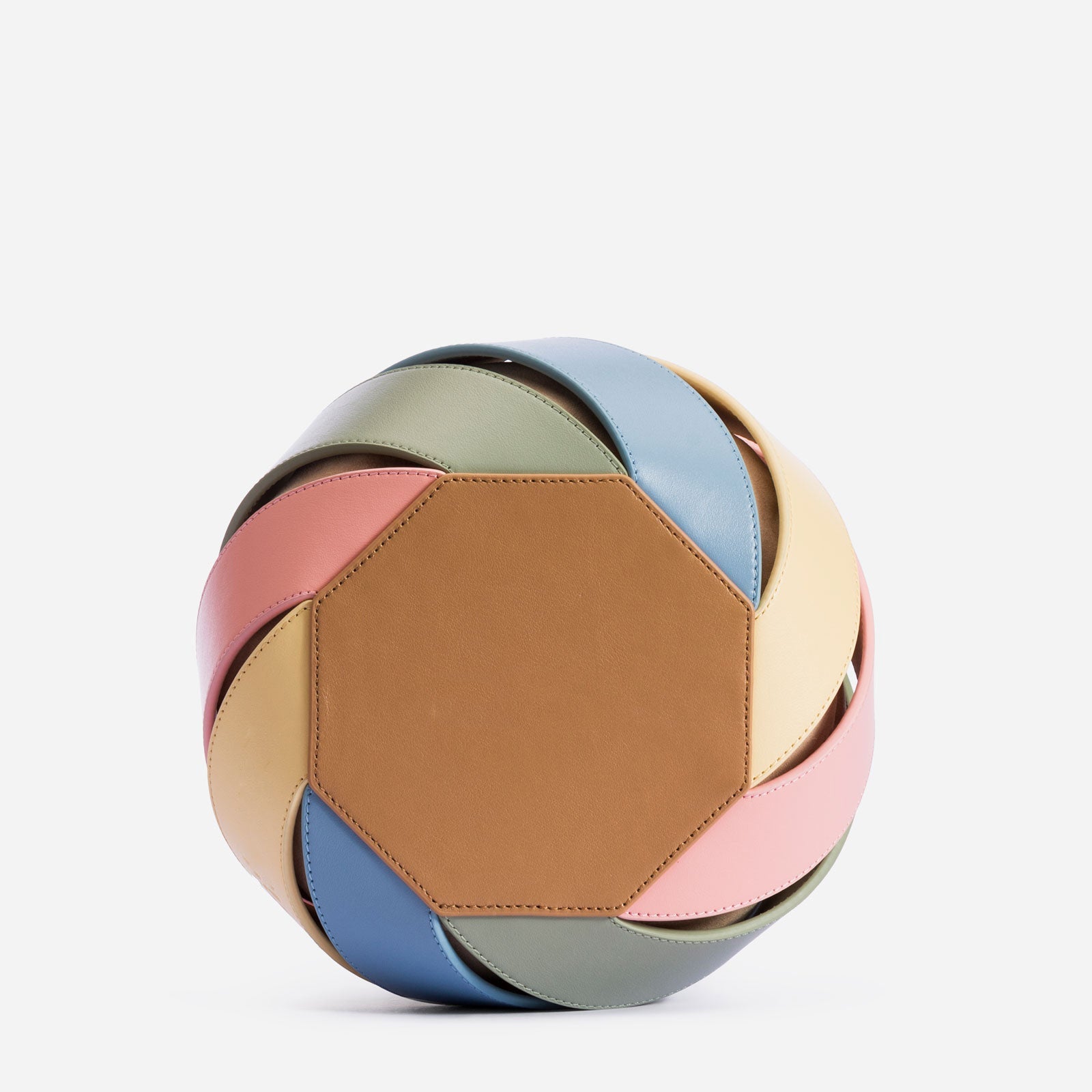 Borsa a secchiello portatile con tracolla cilindrica, cuciture trapuntate a rombi e colori a contrasto