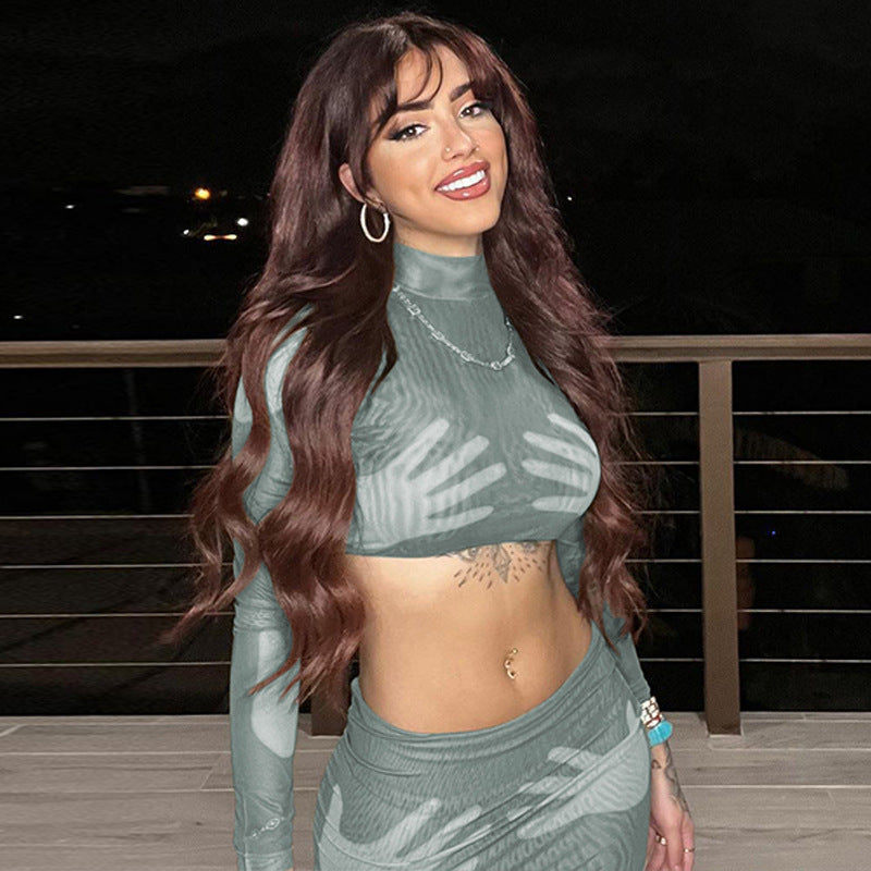 Completo gonna corto e aderente con stampa alla moda, a maniche lunghe e crop top