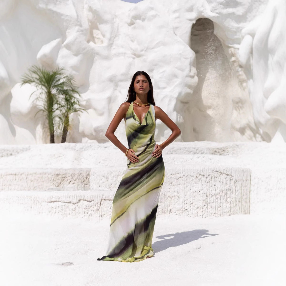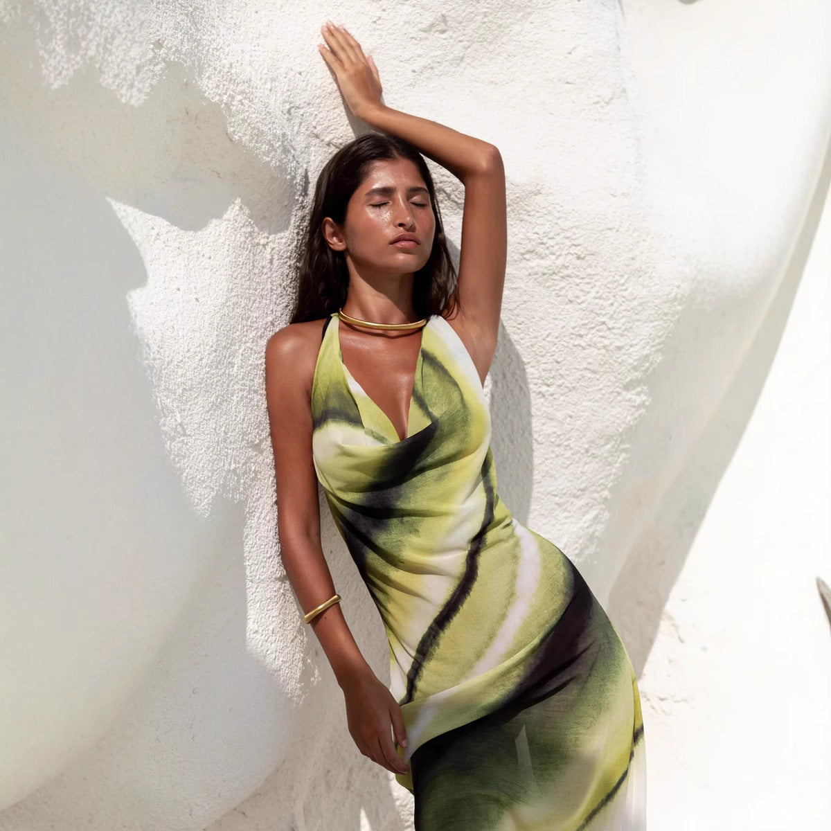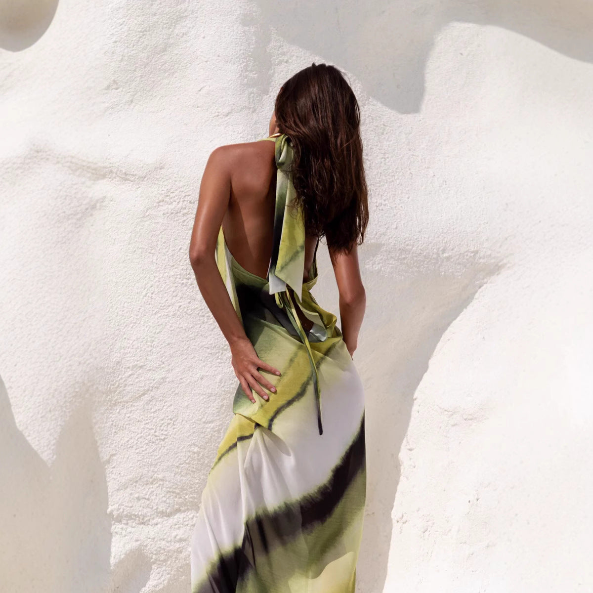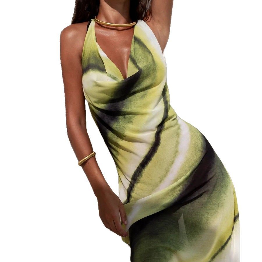 Abito a tubino aderente con scollo a V sexy e schiena scoperta, stampa digitale