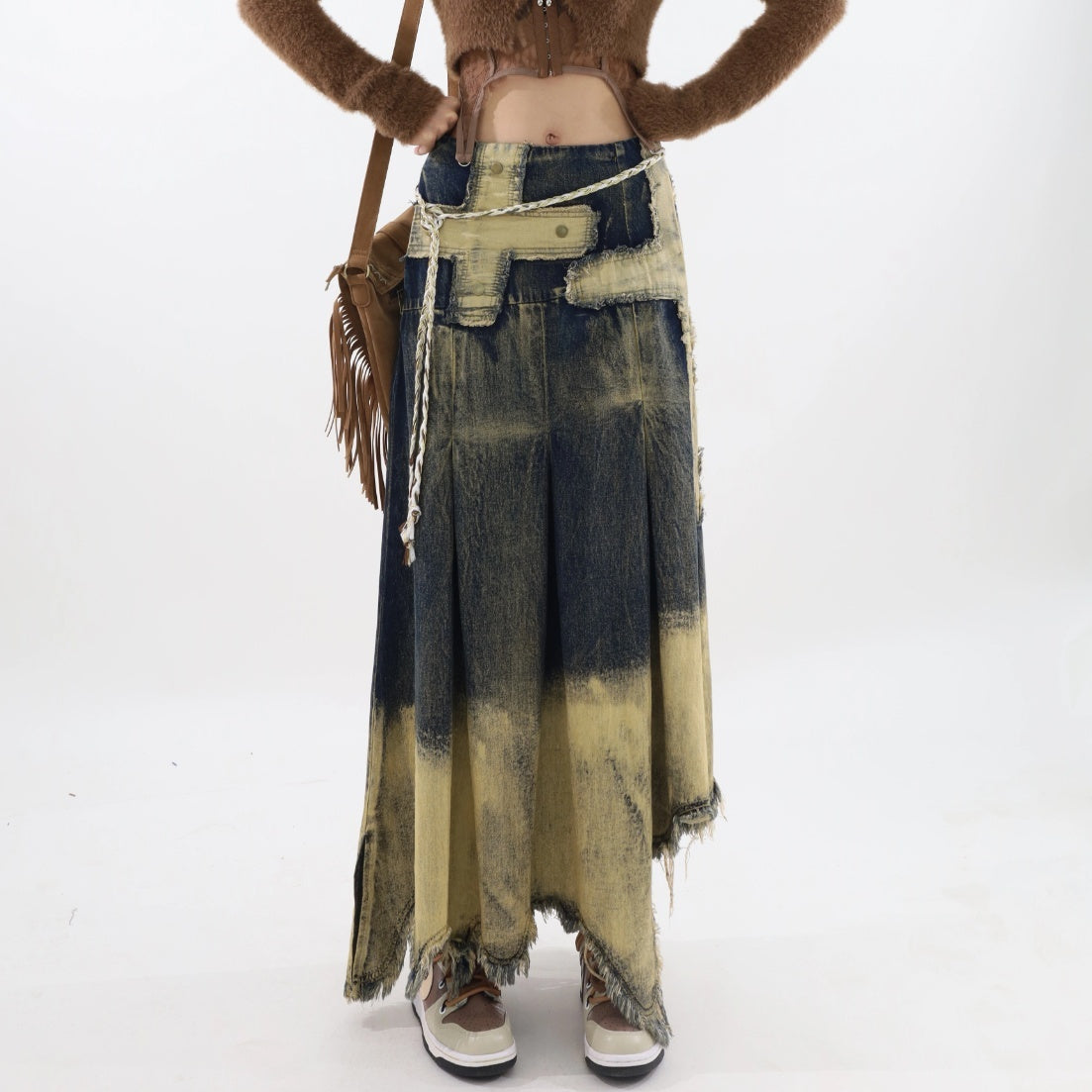 Irregular Patch Distressed Raw Edge Denim Skirt