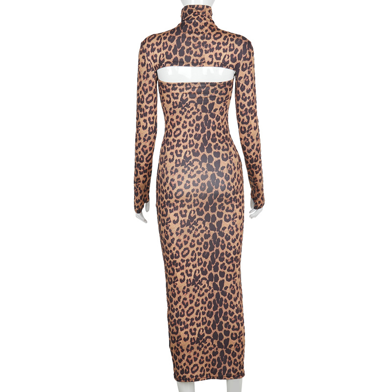 Long-sleeved High-neck Hollow Leopard-print Wrap-chest Skirt
