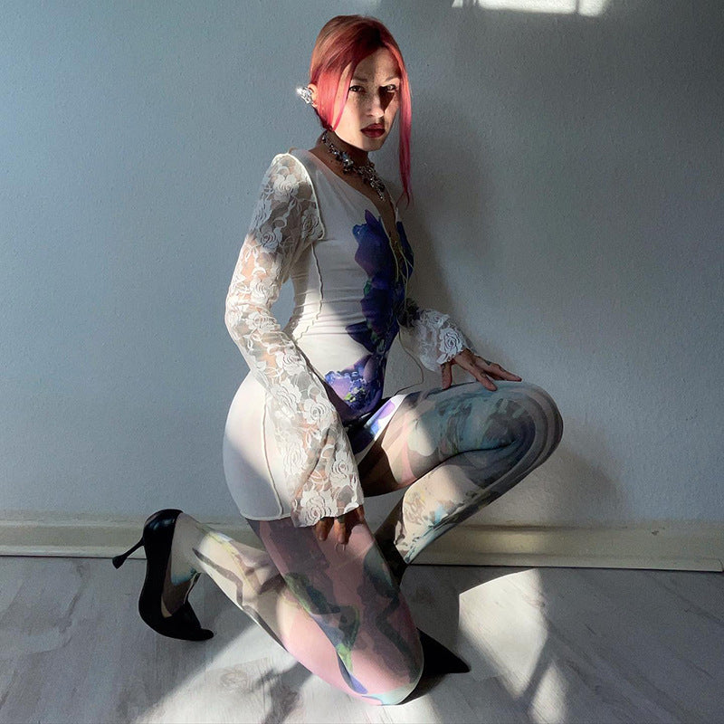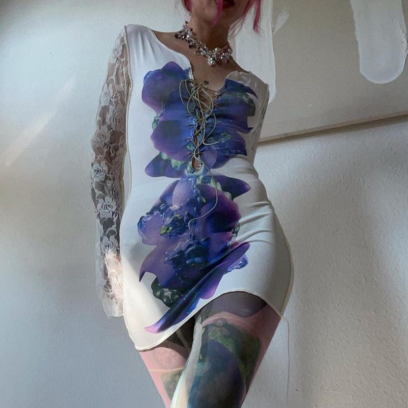 Long-sleeved Printed Lace-up Mesh High-waisted Dress