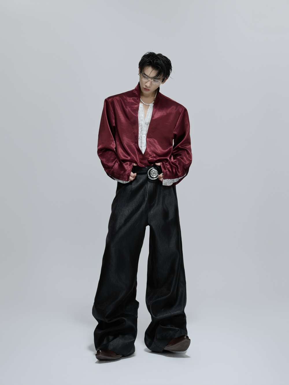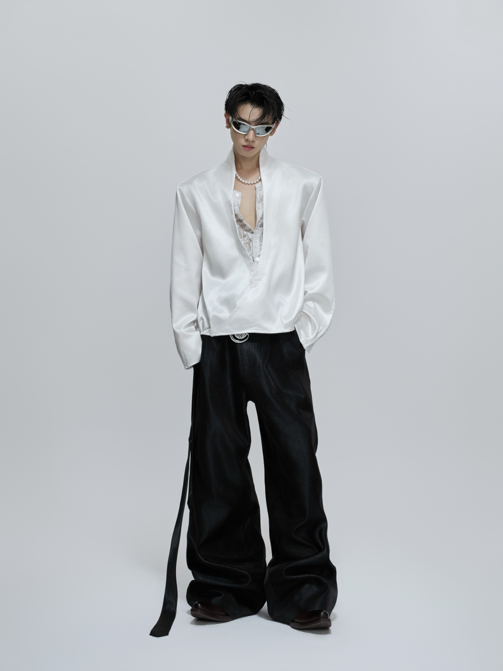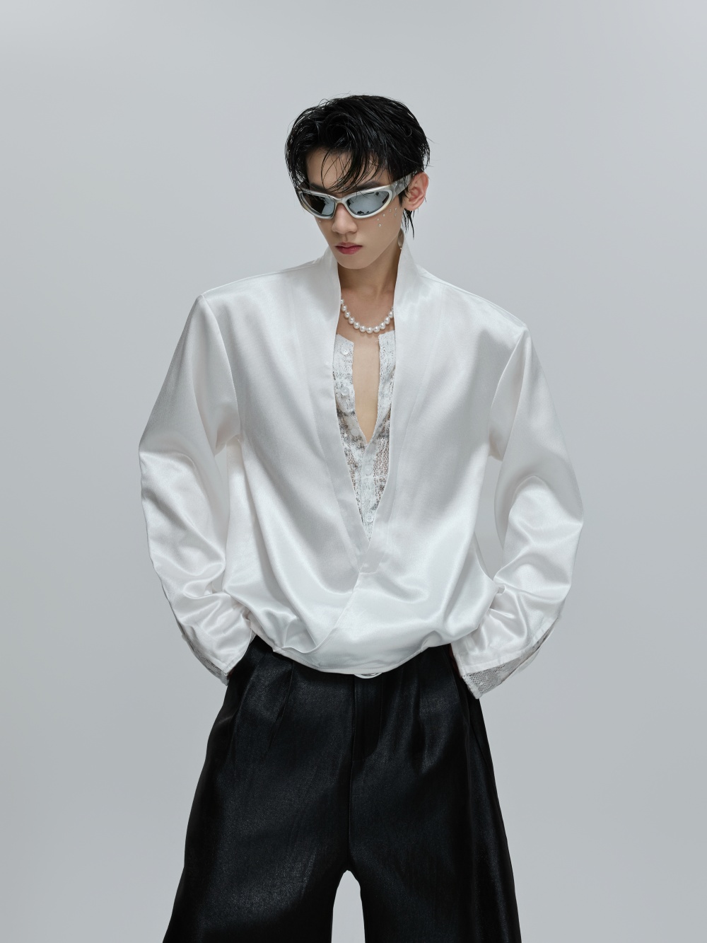 Loose-fitting Faux Two-piece V-neck Lace-panel Shirt