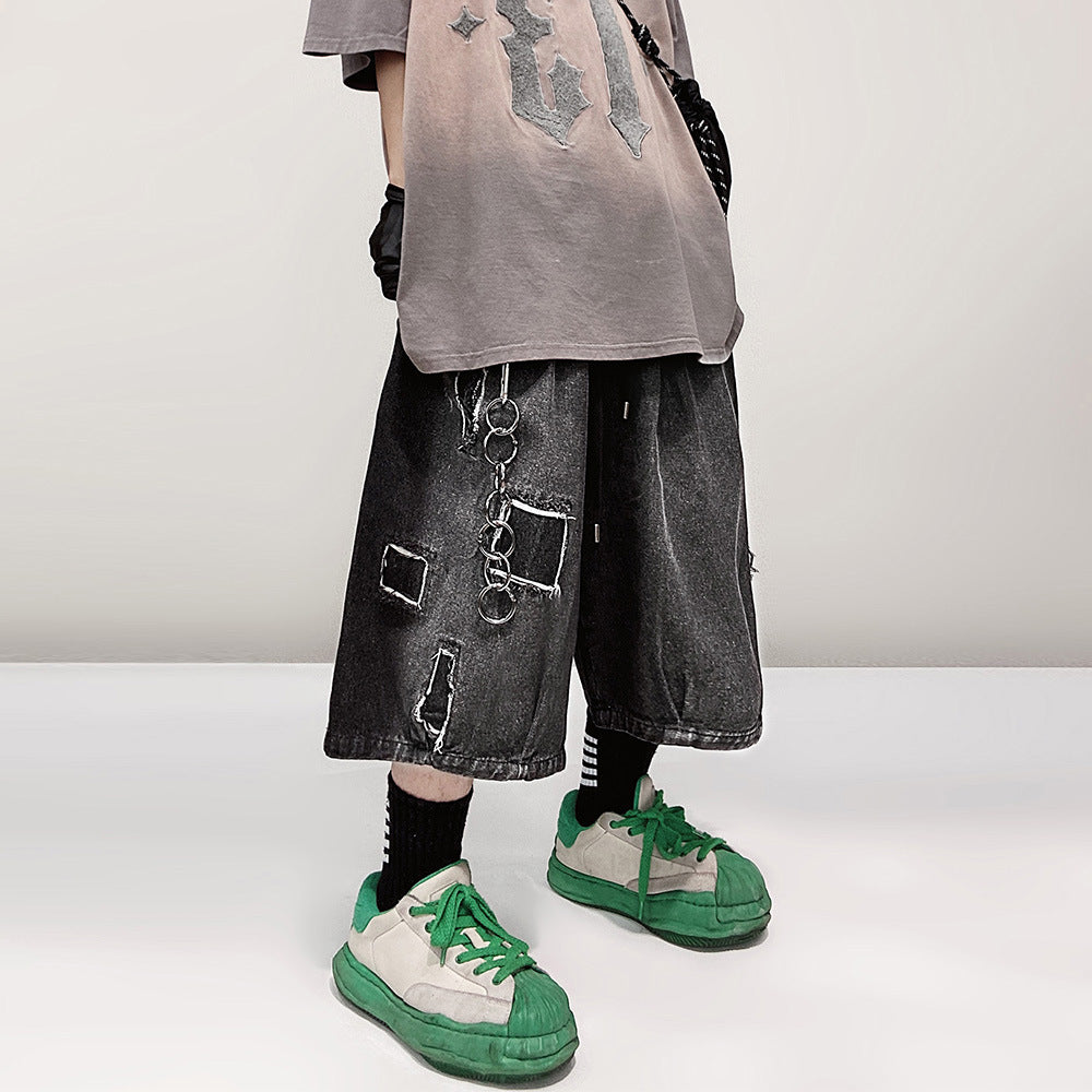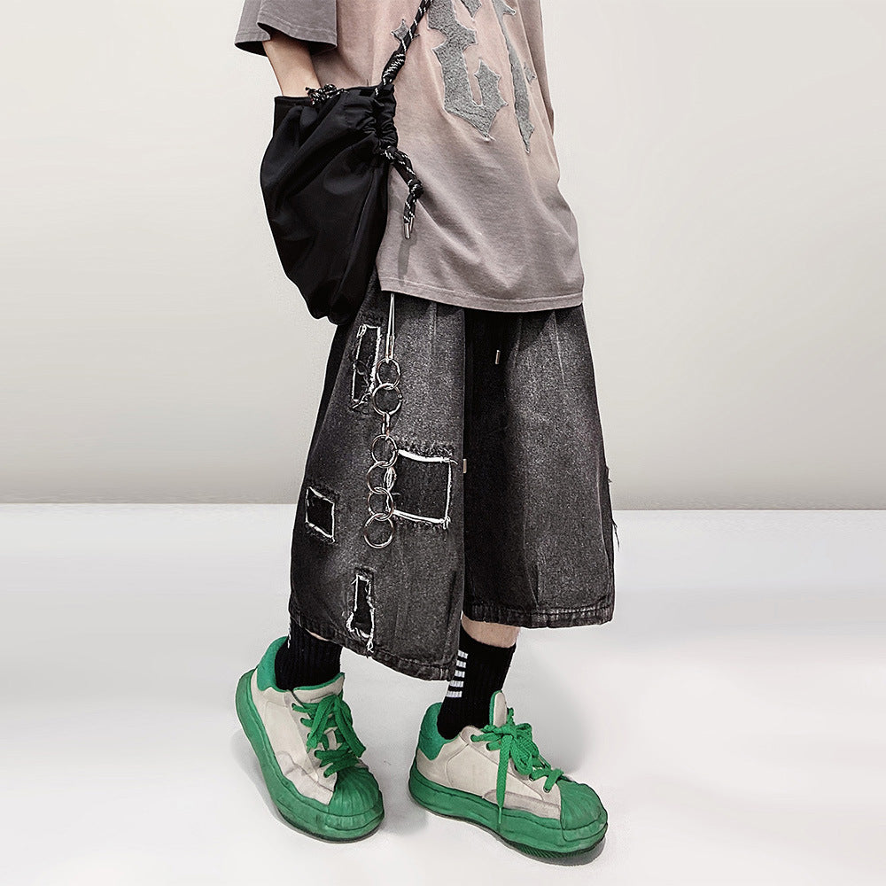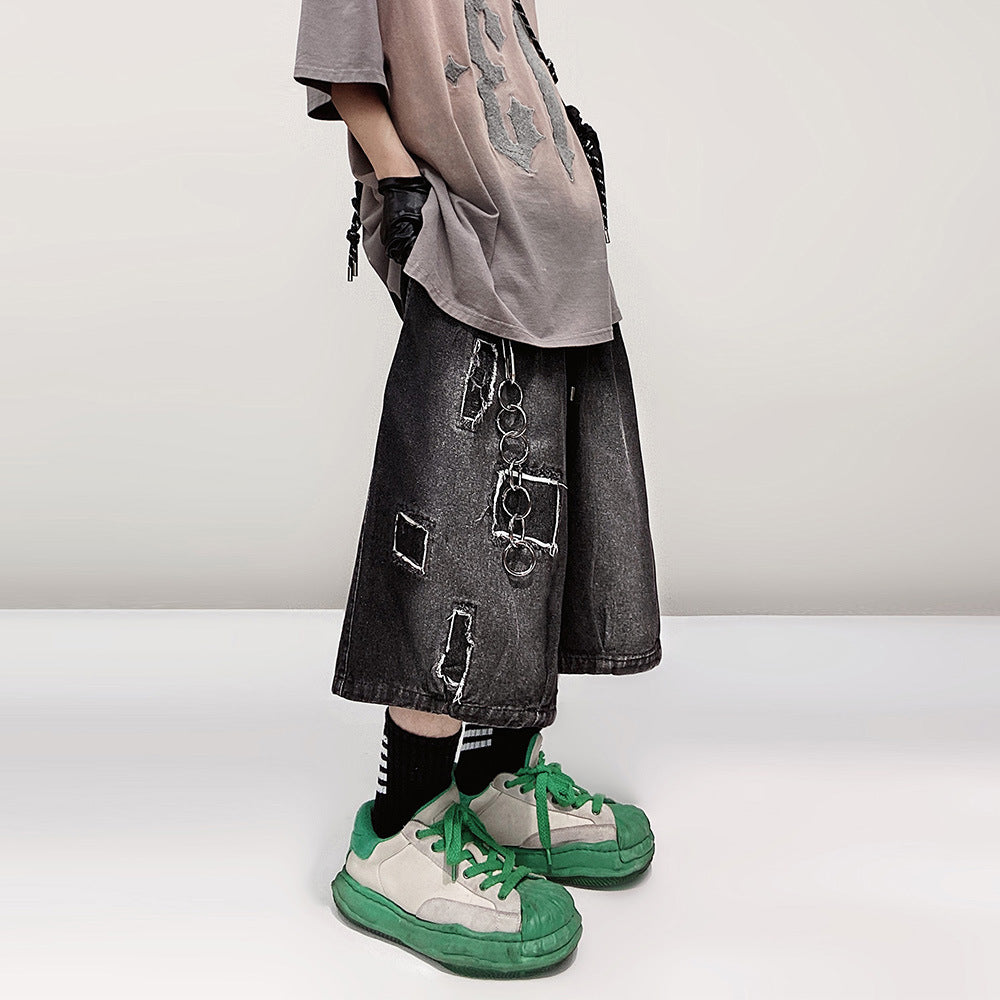 Pantaloncini corti vintage estivi in denim a gamba larga con toppe vintage