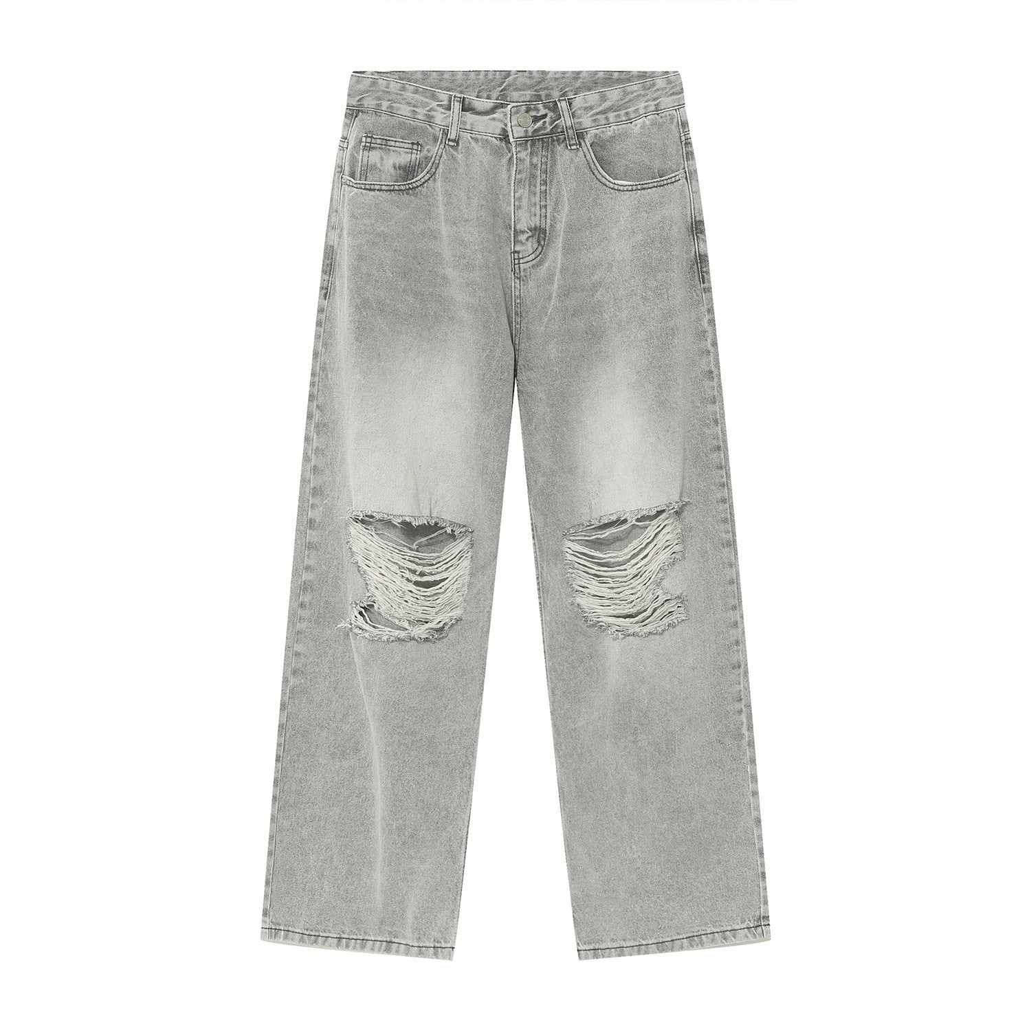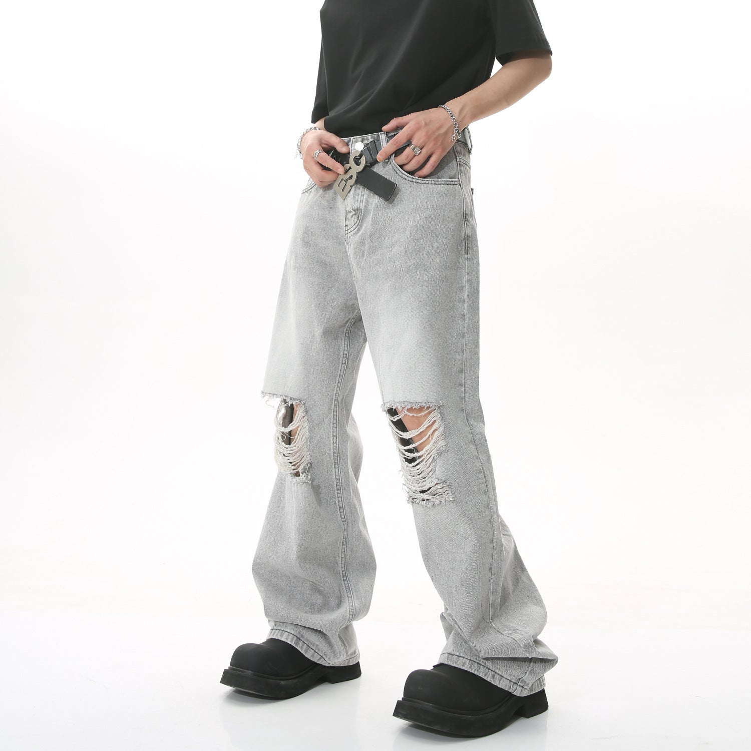 Men's Ripped Washed Light Gray Knee Ripped Wide-legged Straight-leg Denim Trousers