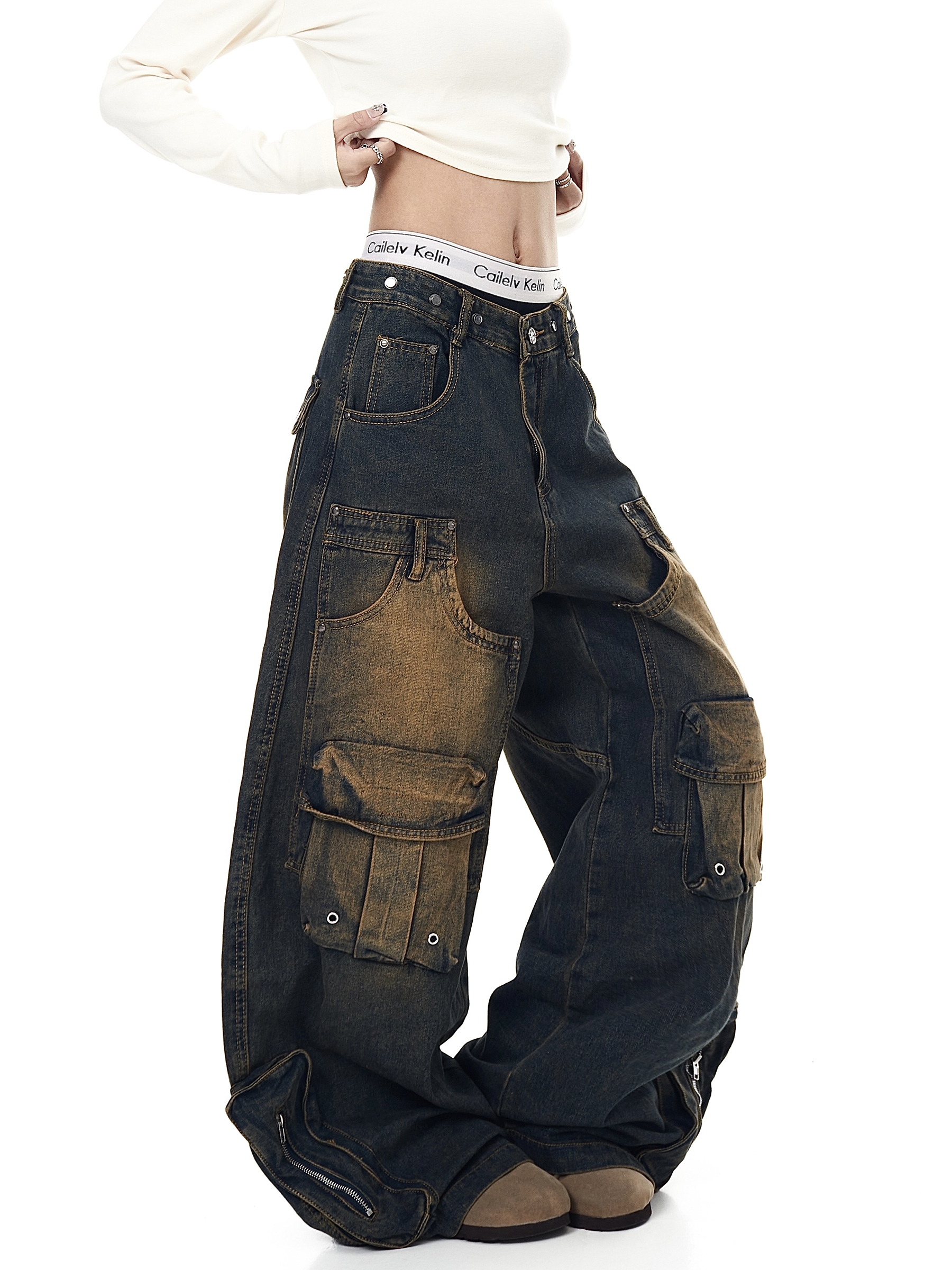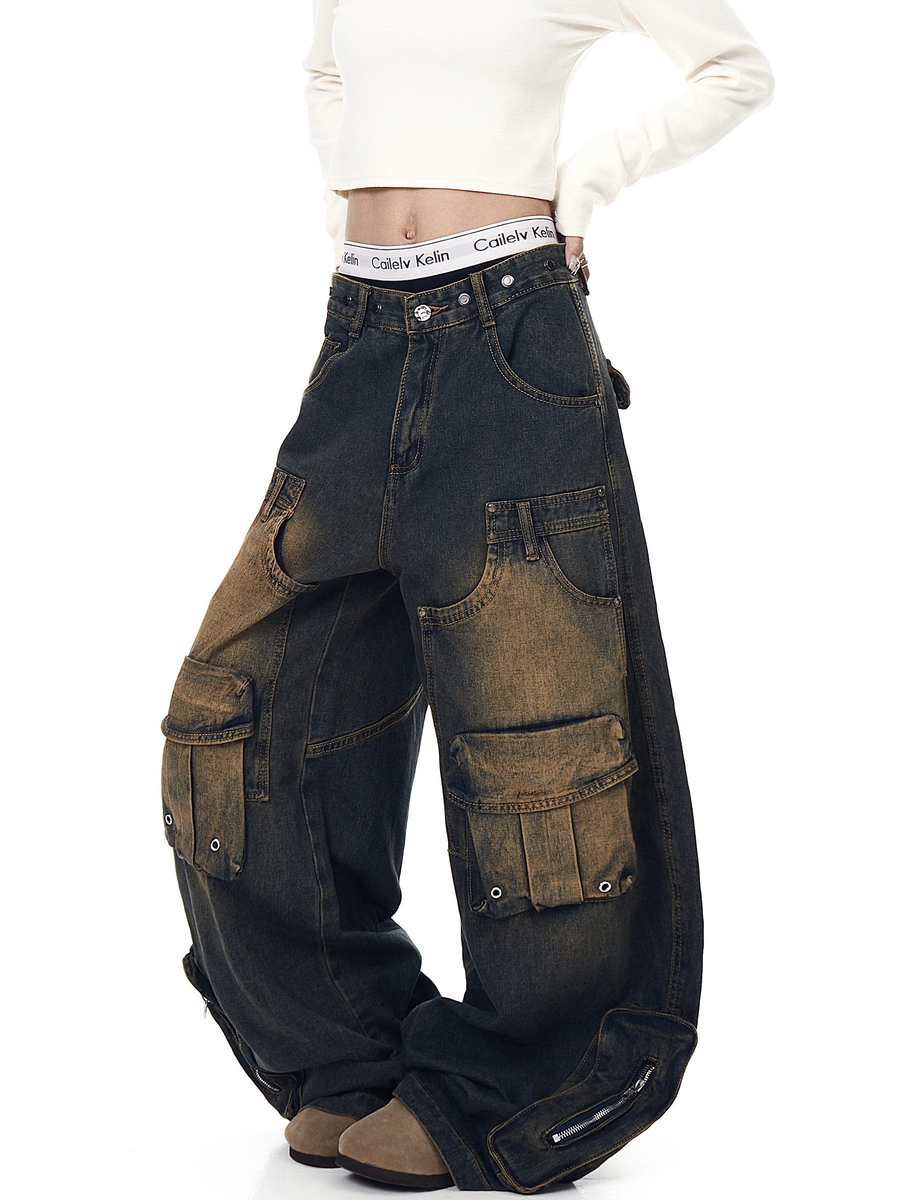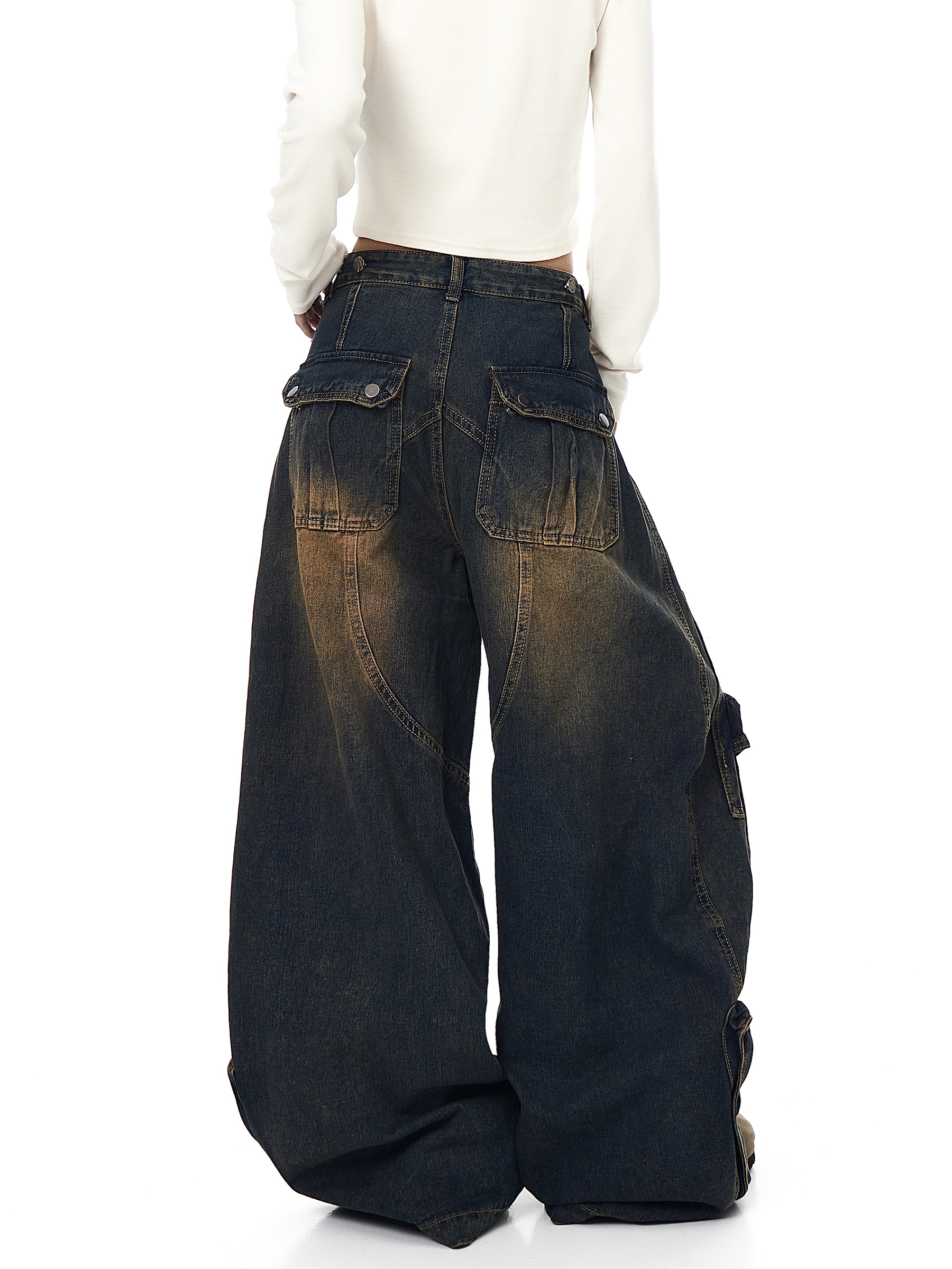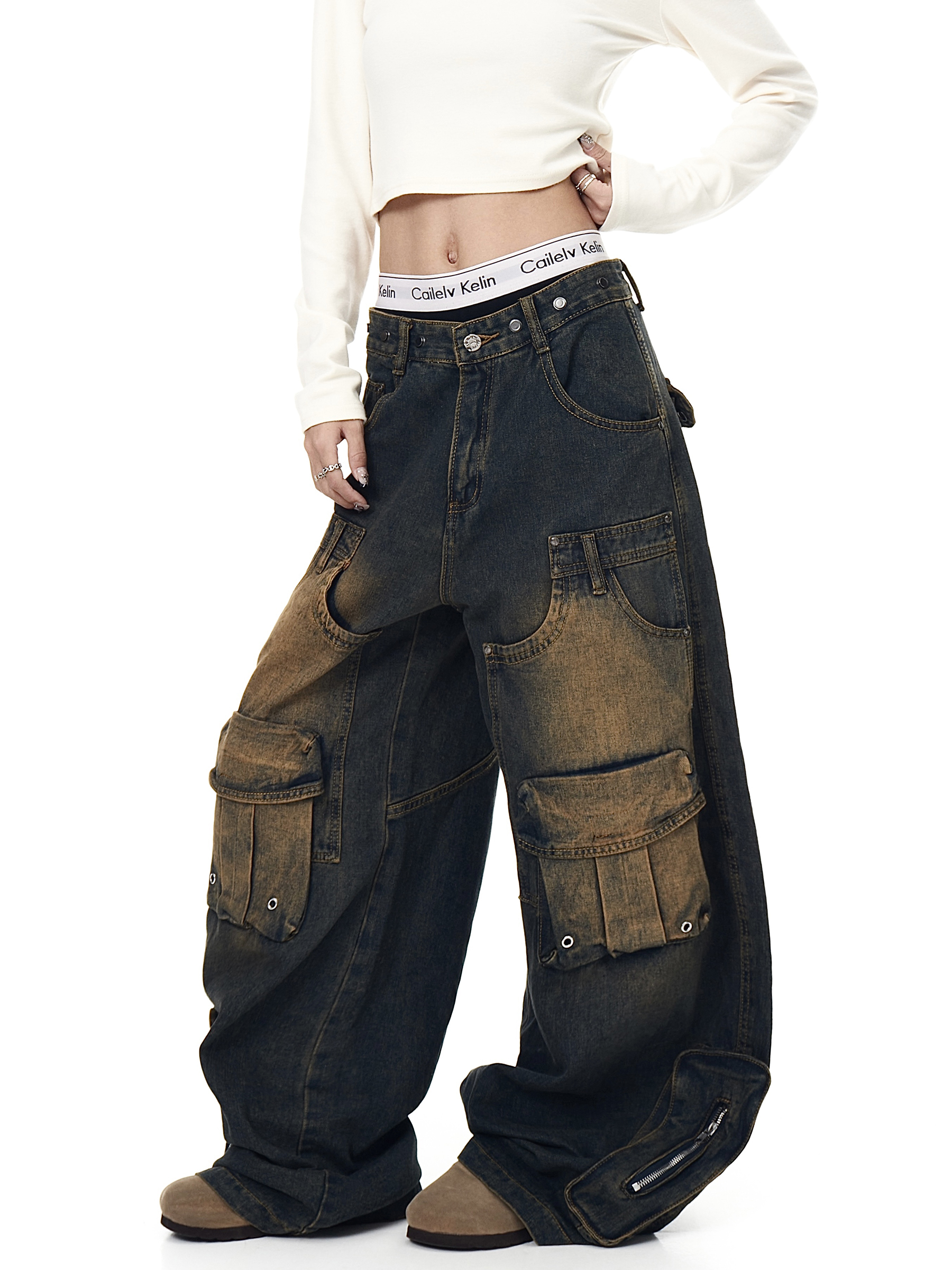 Retro Washed Distressed Multi-pocket Cargo Pants Loose Wide Leg Jeans