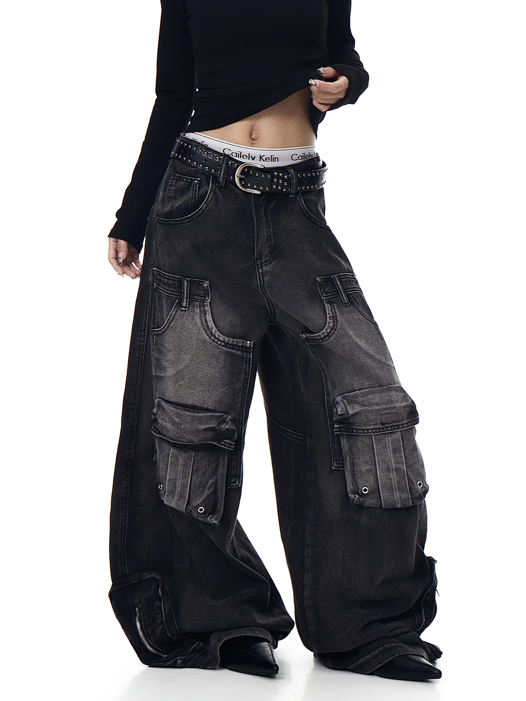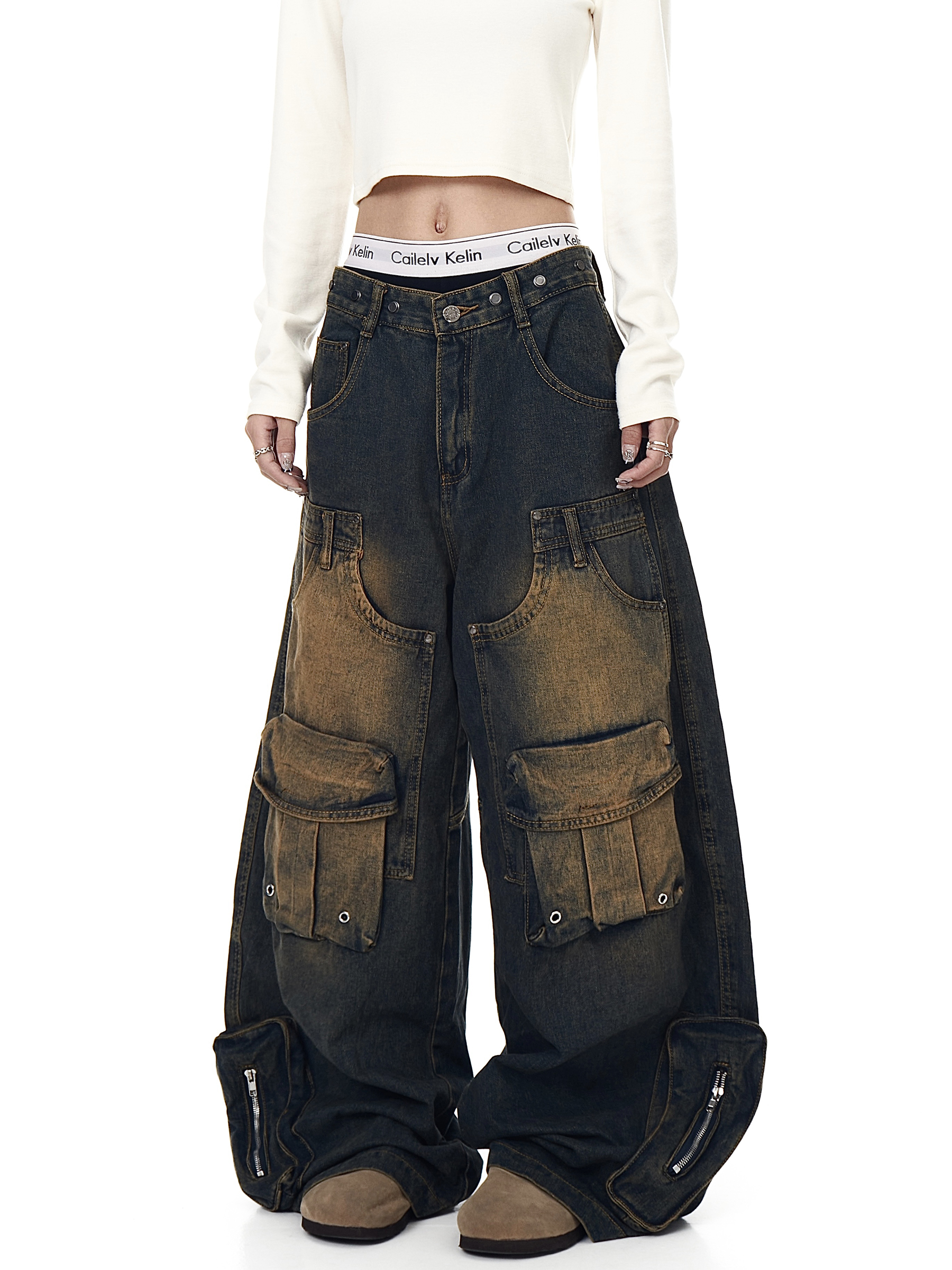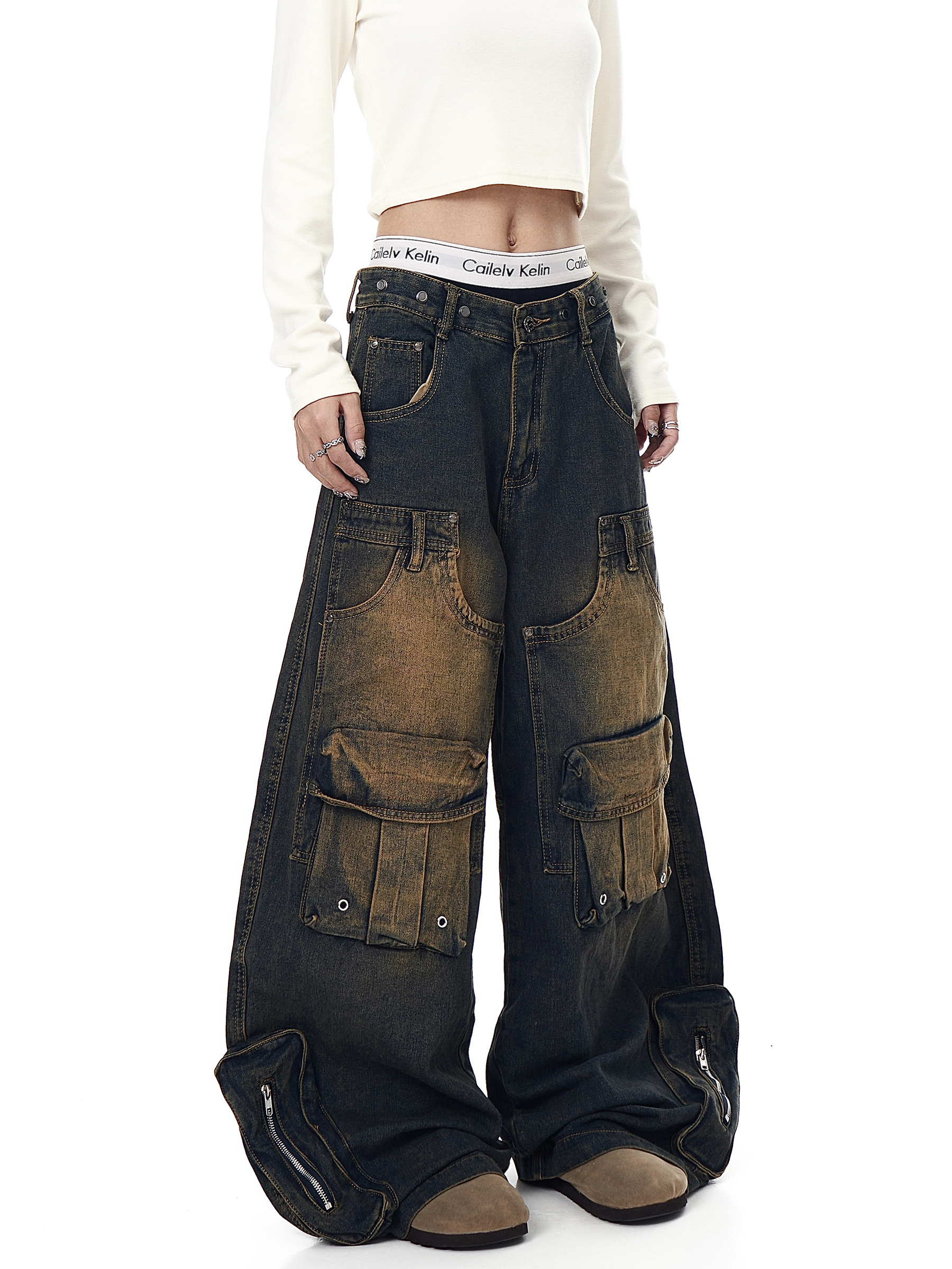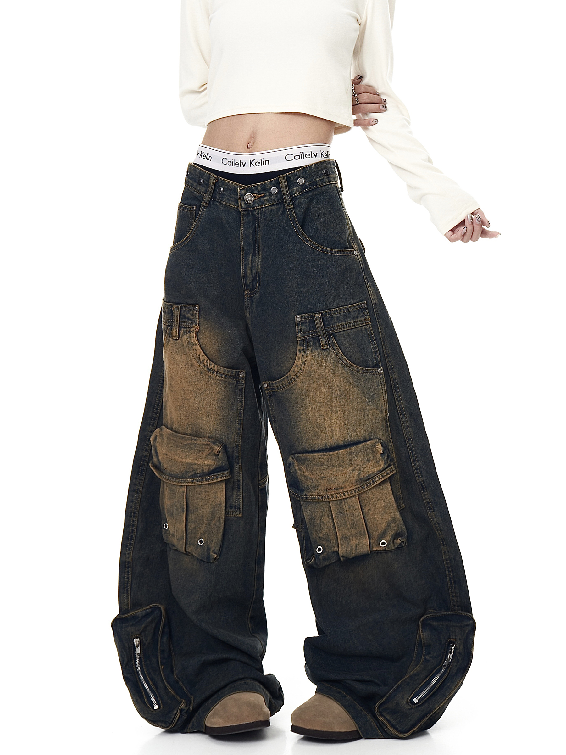 Retro Washed Distressed Multi-pocket Cargo Pants Loose Wide Leg Jeans