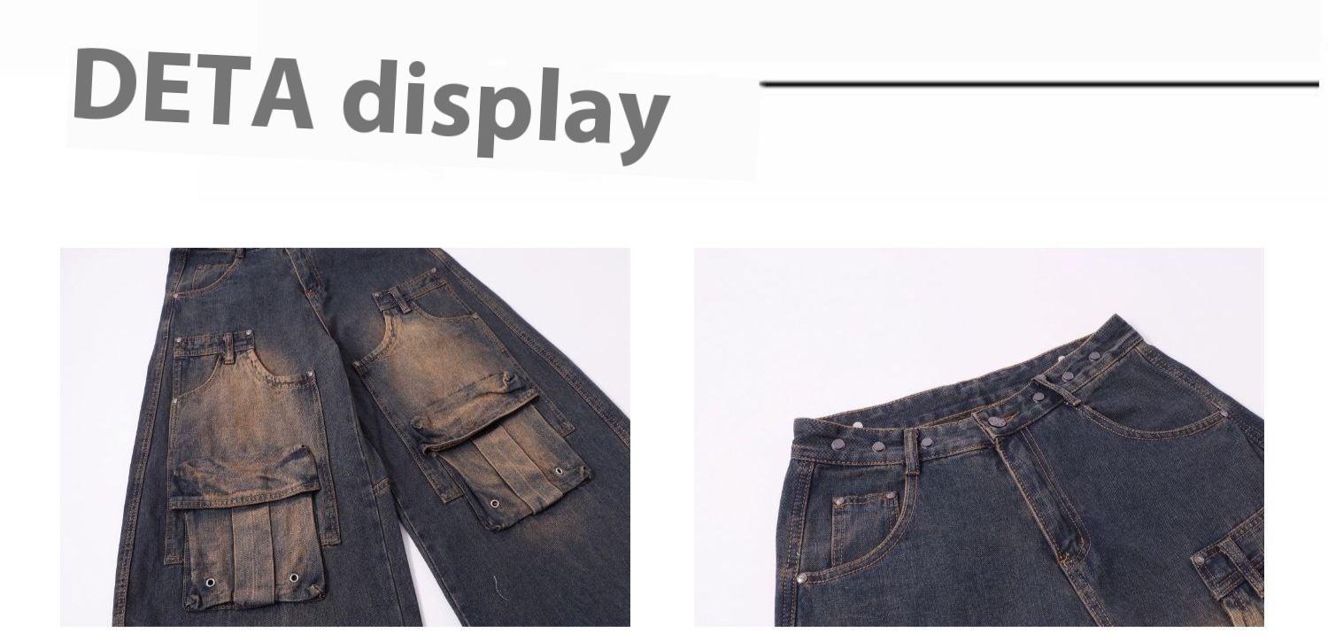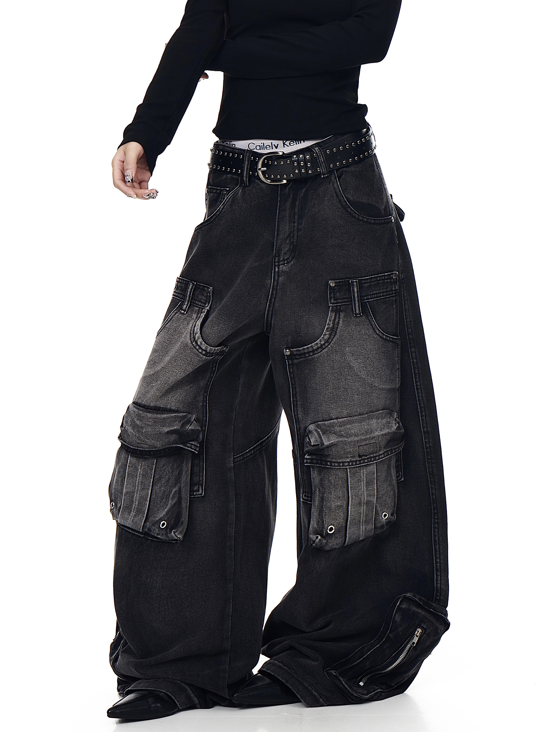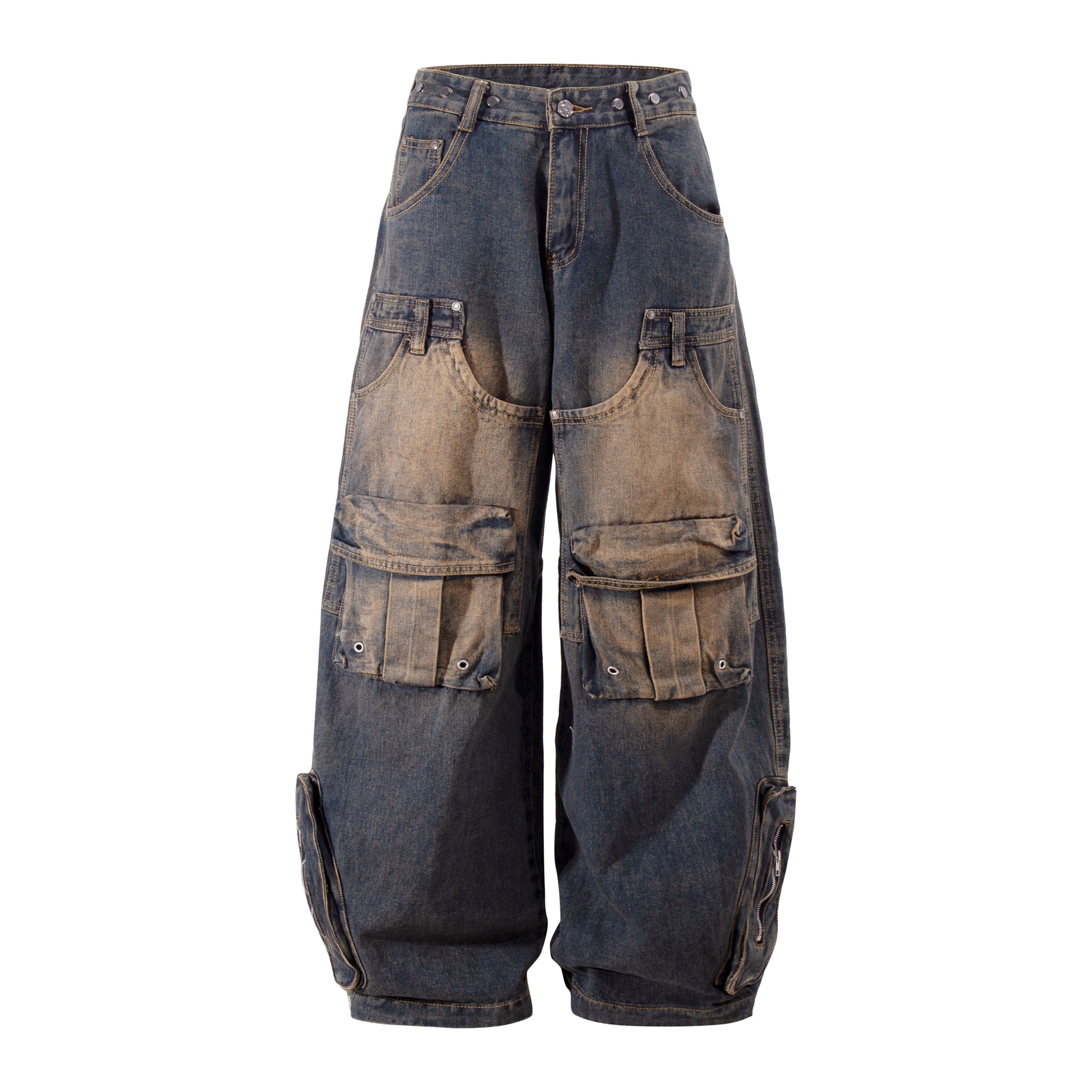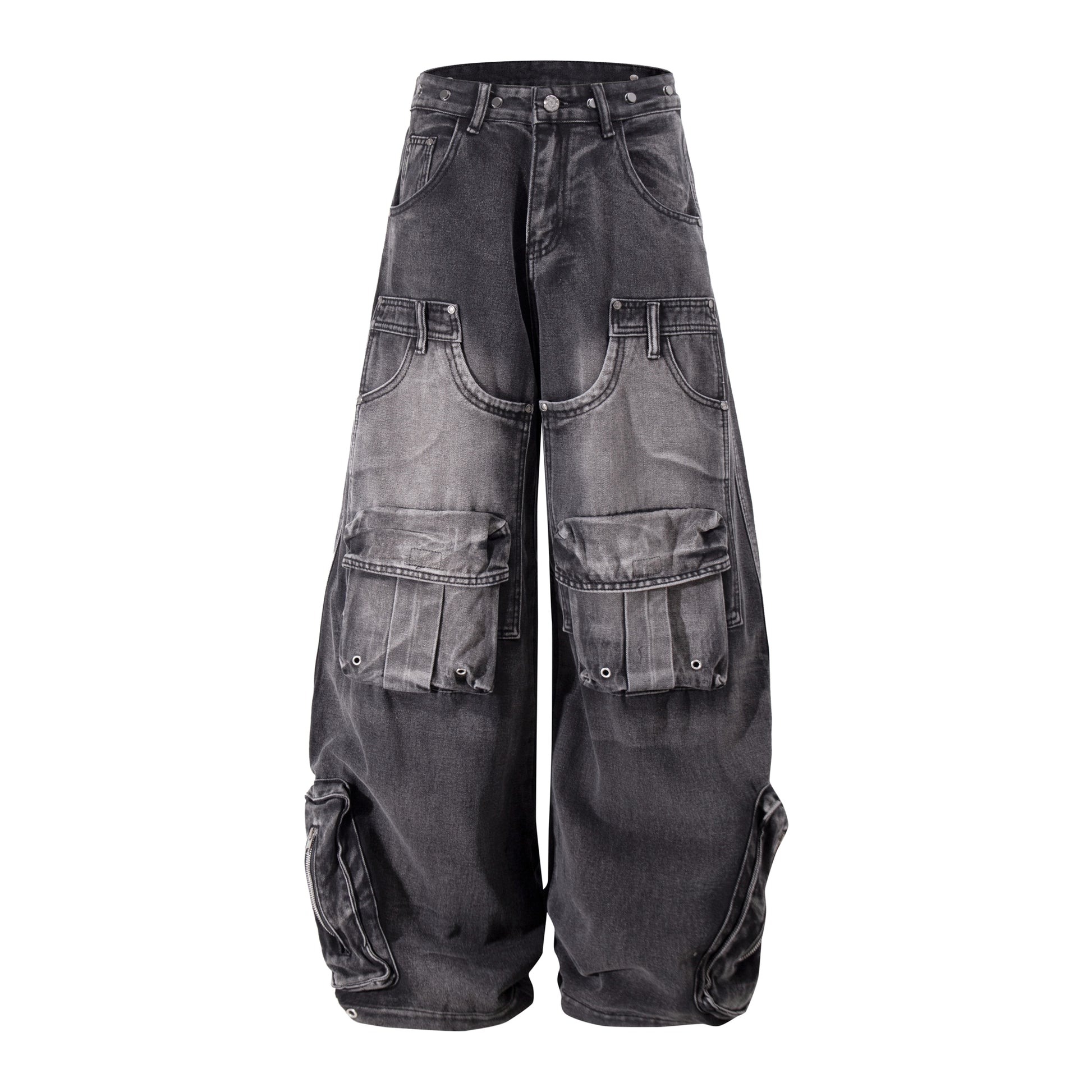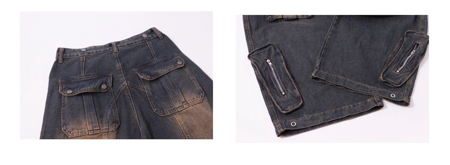 Retro Washed Distressed Multi-pocket Cargo Pants Loose Wide Leg Jeans
