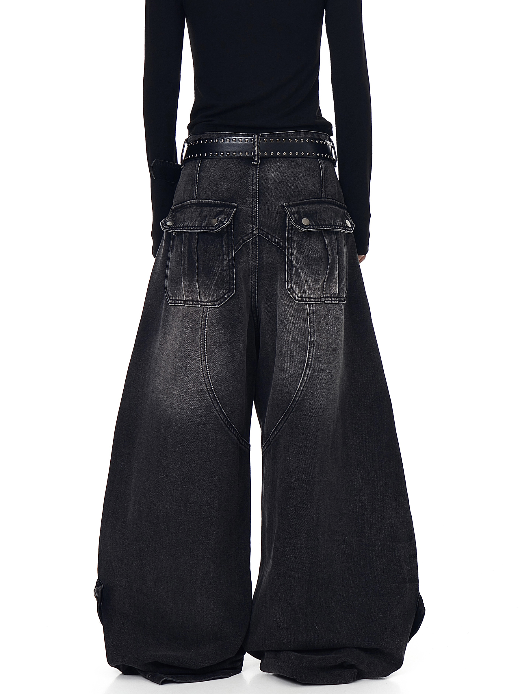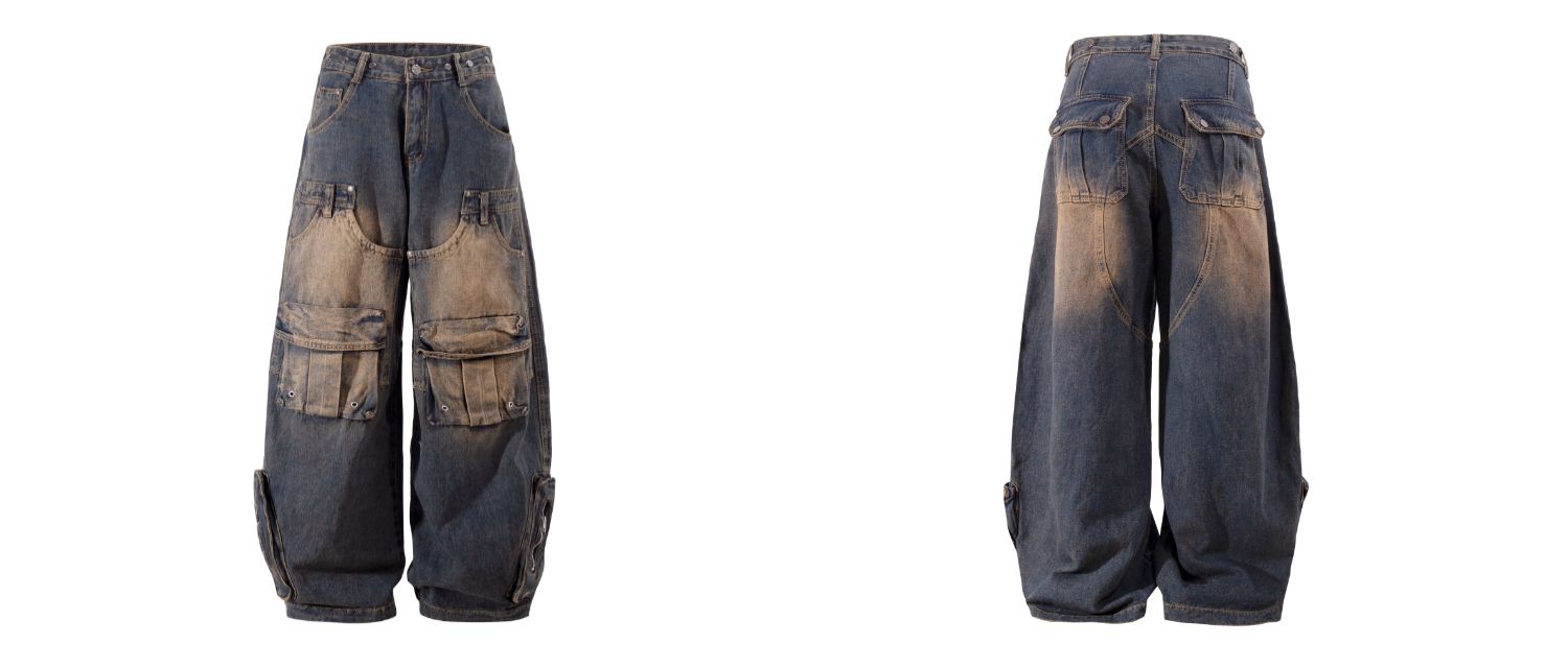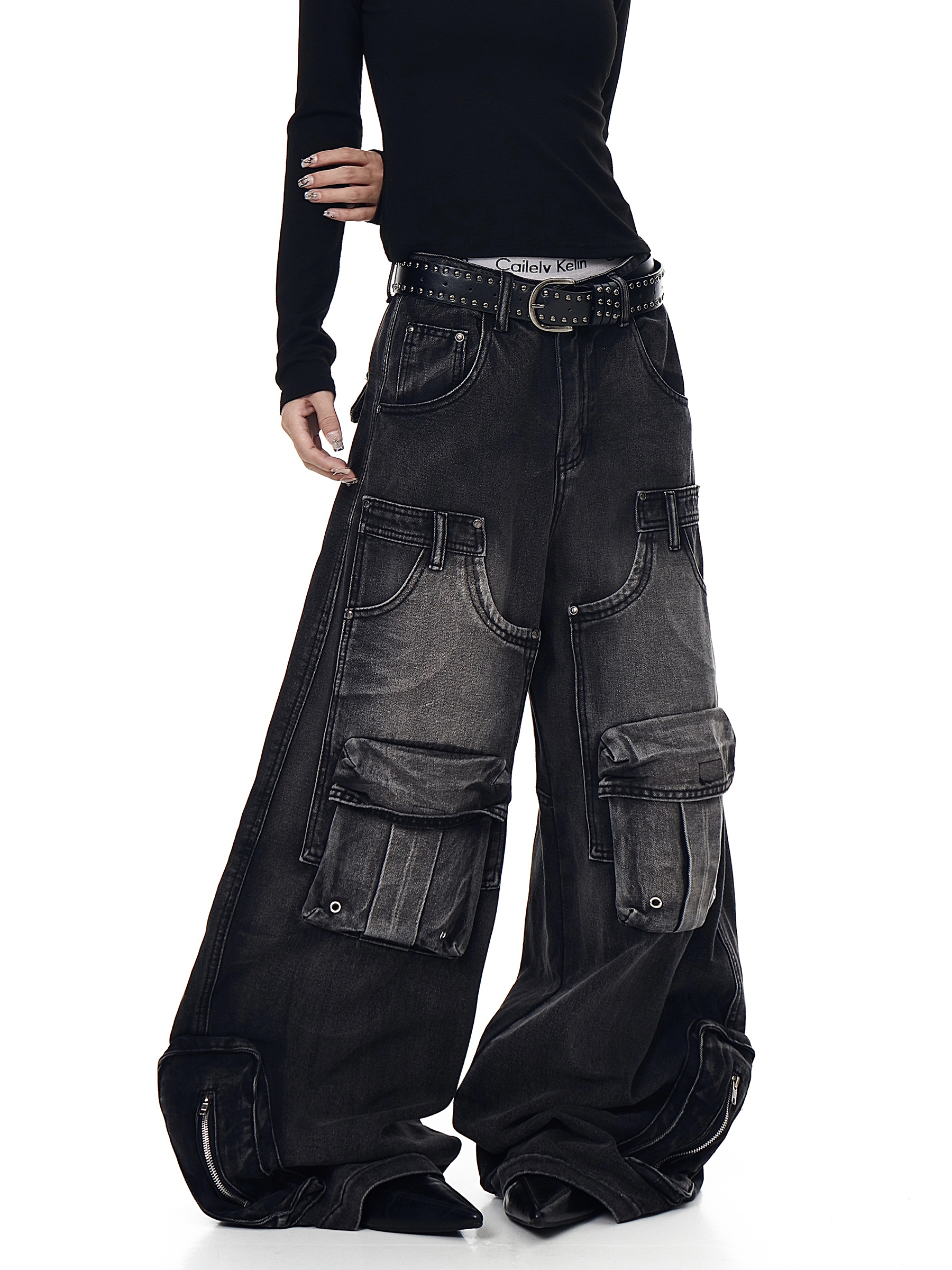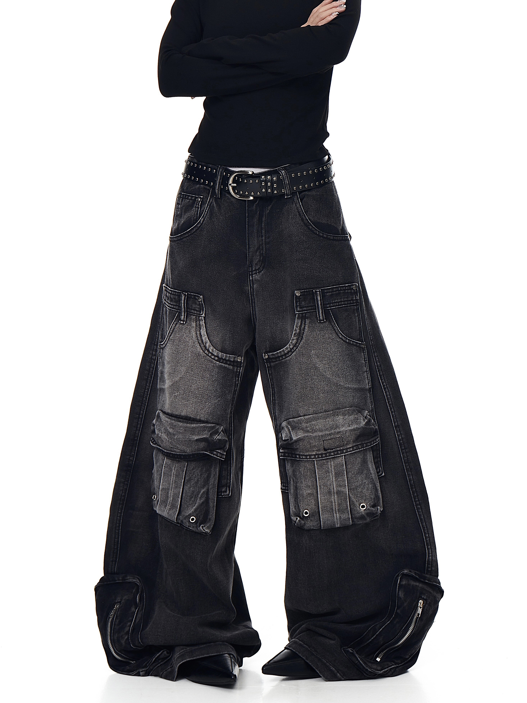 Retro Washed Distressed Multi-pocket Cargo Pants Loose Wide Leg Jeans