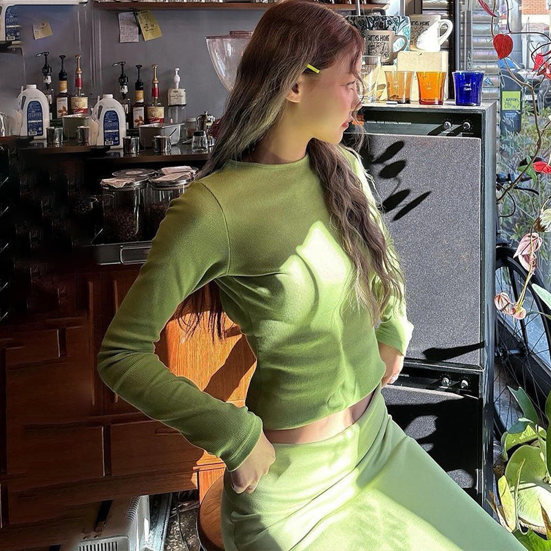Round Neck Long Sleeve T-shirt Patchwork Slit Long Skirt Suit