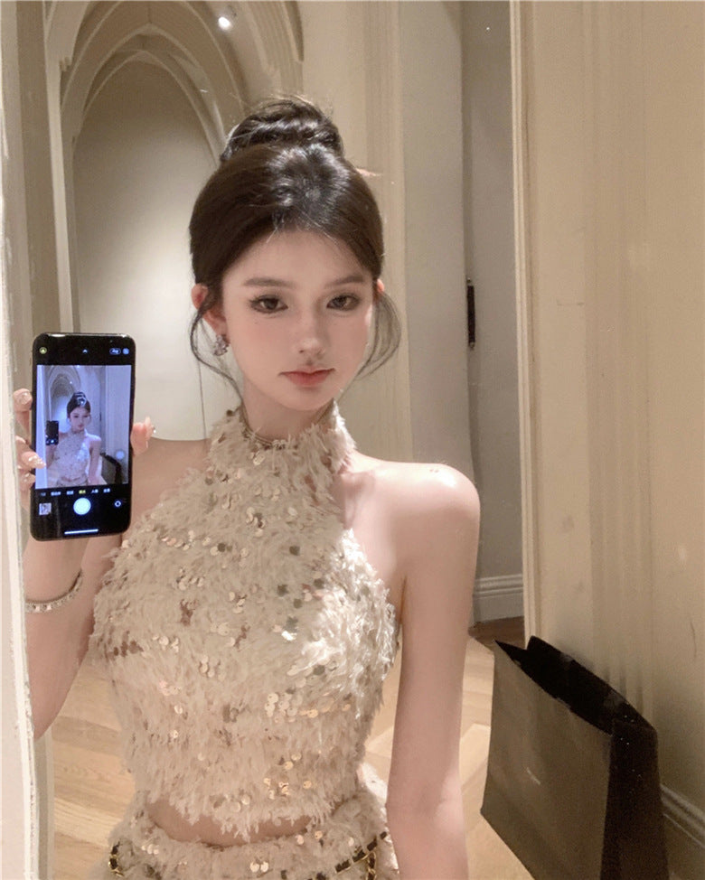 Sequined Tassel Halter Spaghetti Straps Vest Sheath Skirt