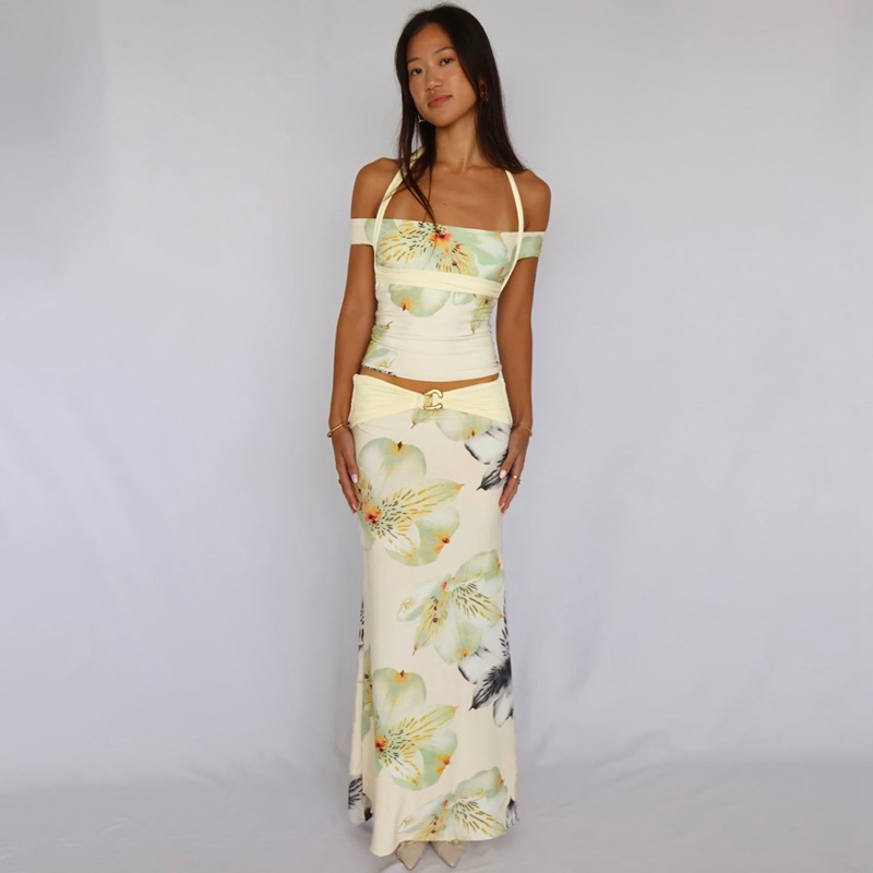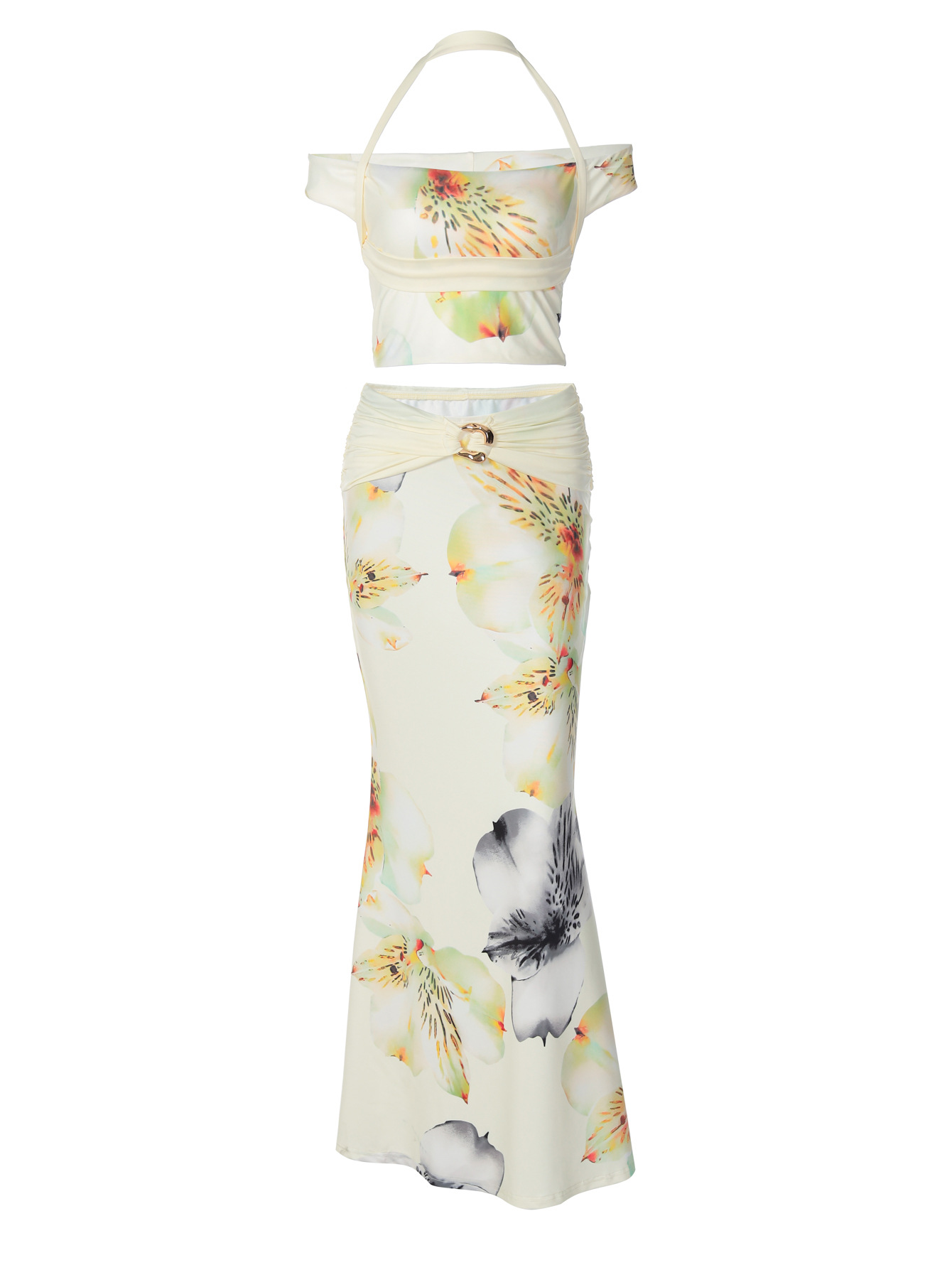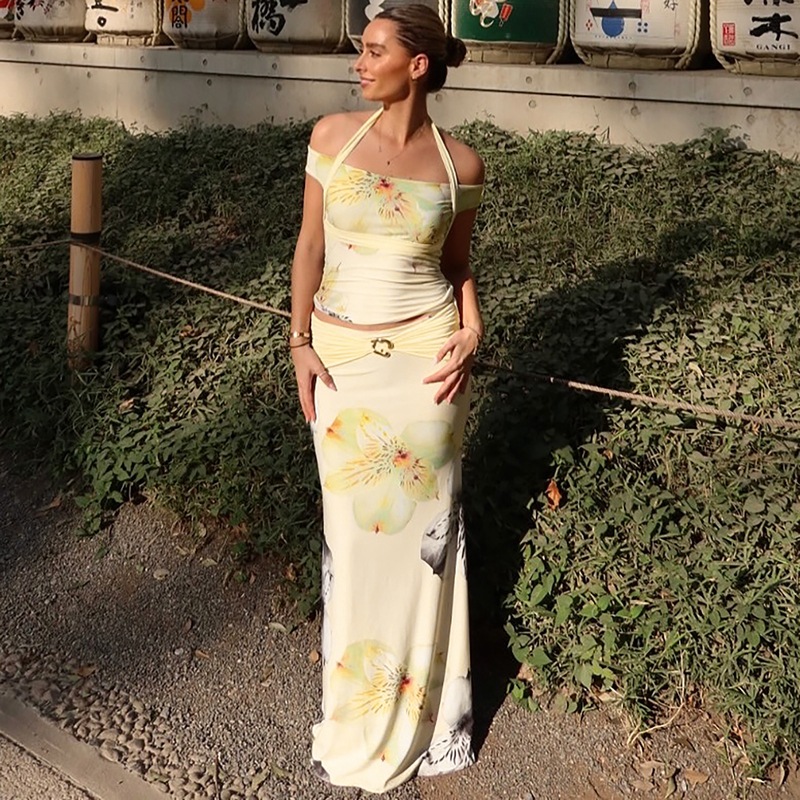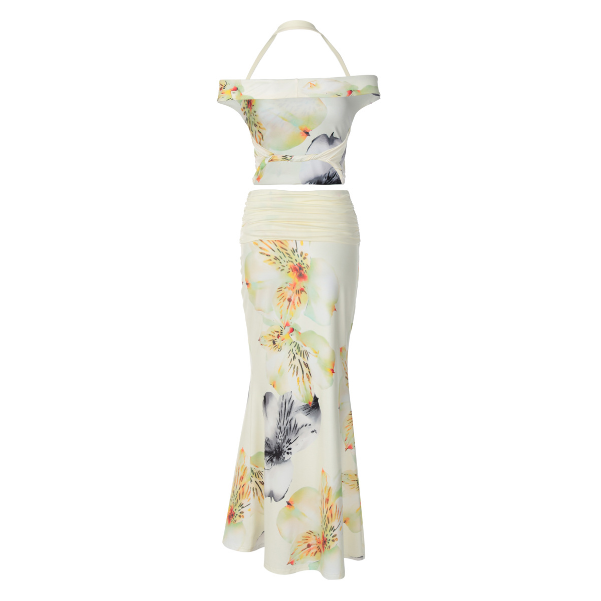 Sexy Backless Halter Top Slim-fit Printed Dress Two-piece Set