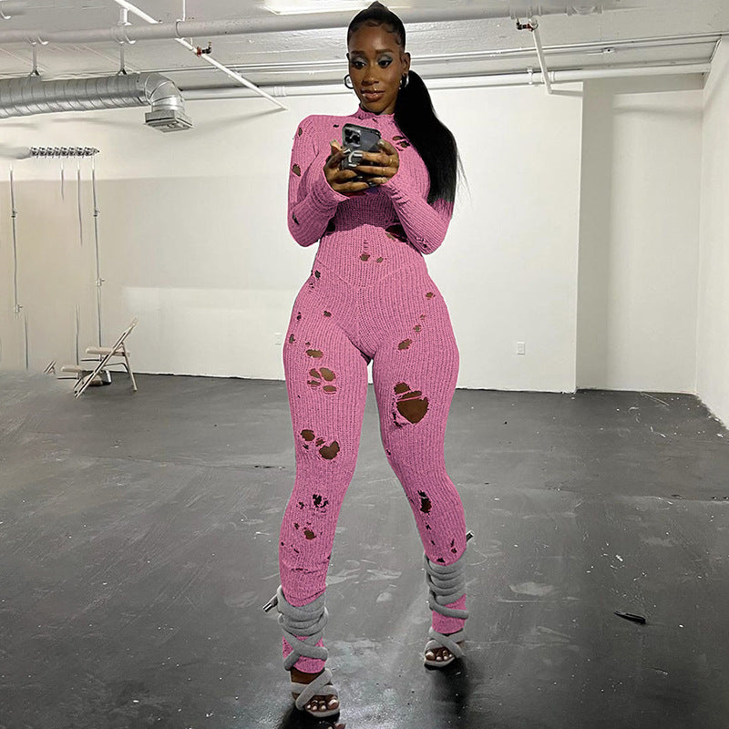 Solid Color Casual Long Sleeves Wool Lace-up Ripped Slim Fit Long Conjoined Trousers