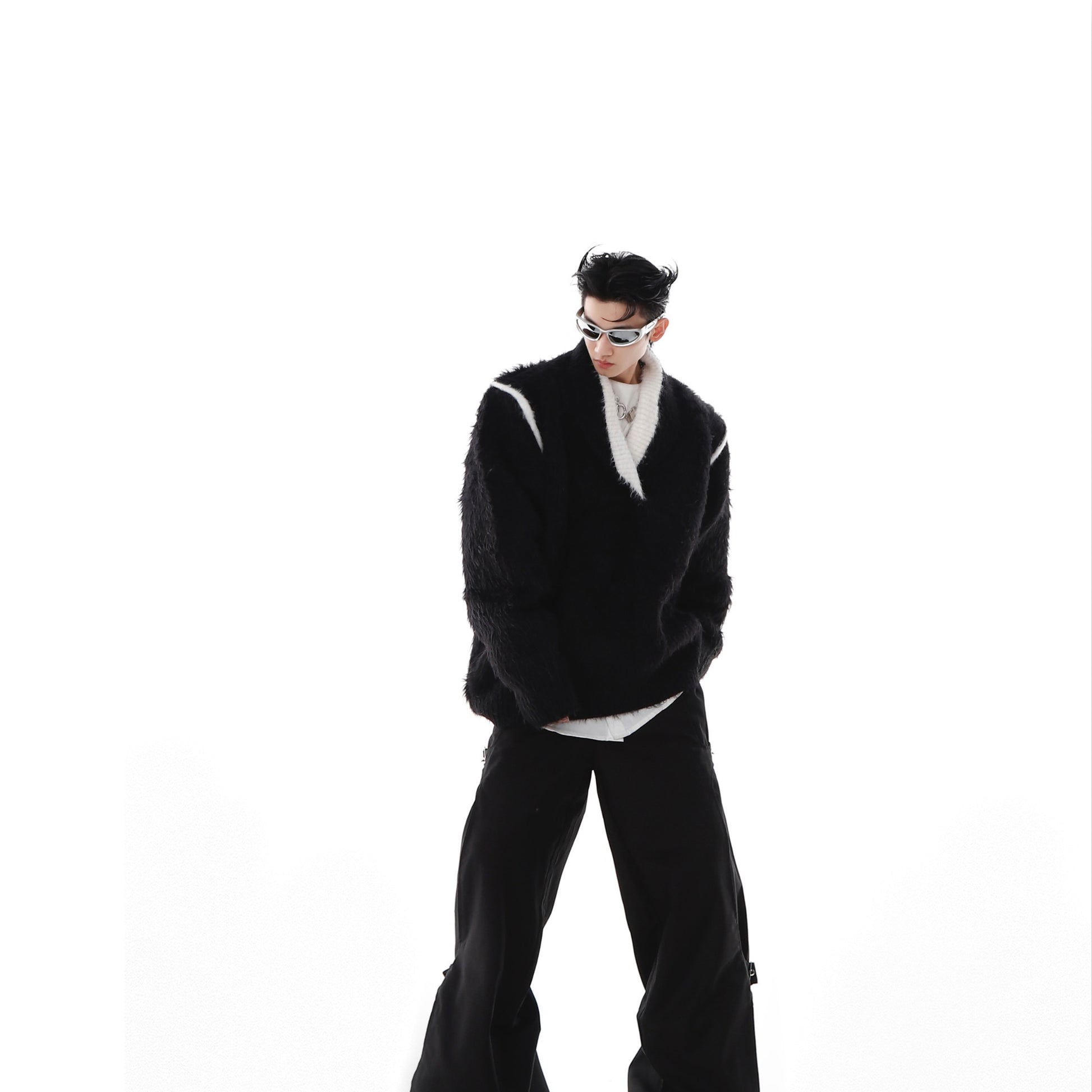 V-neck Anti-mink Plush Sweater Loose Thick Sweater Contrast Color Design Knitted Top