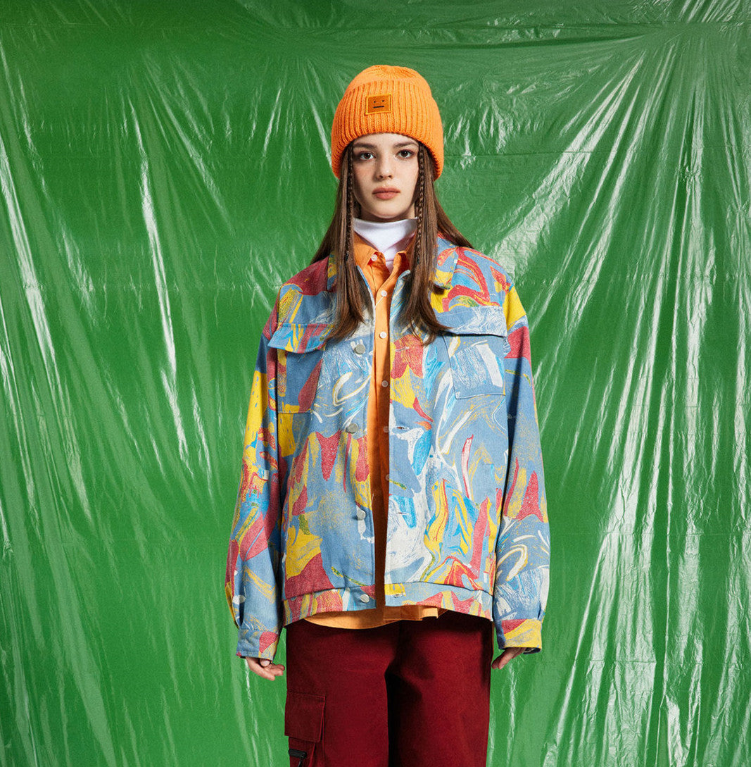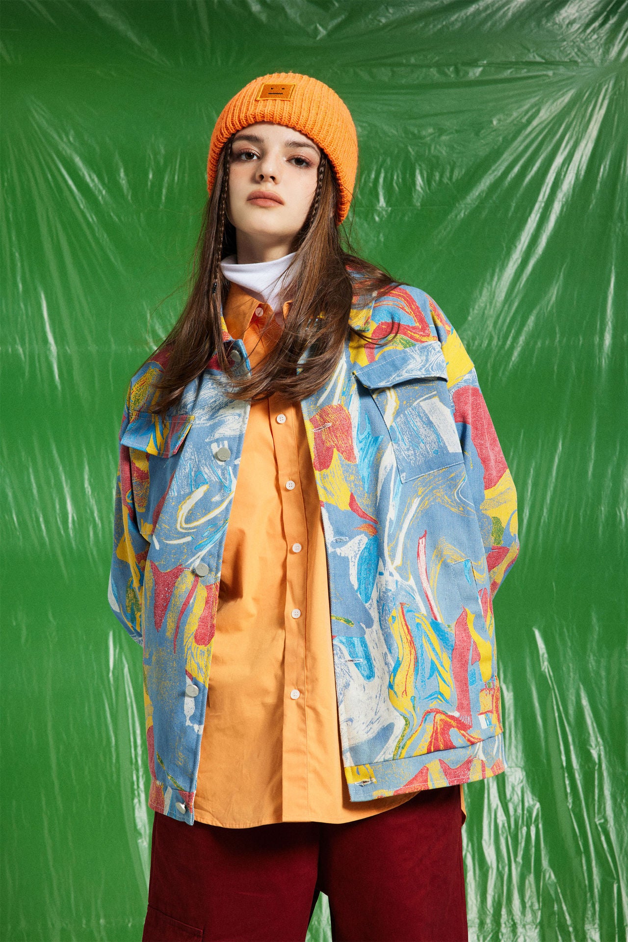 Giacca in denim con graffiti e dipinti a inchiostro vintage