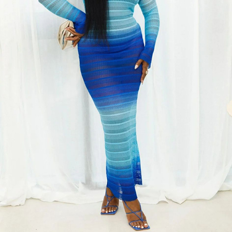 Fashion Gradient Printed Round Neck Long Sleeve High Waist Perspective Dress