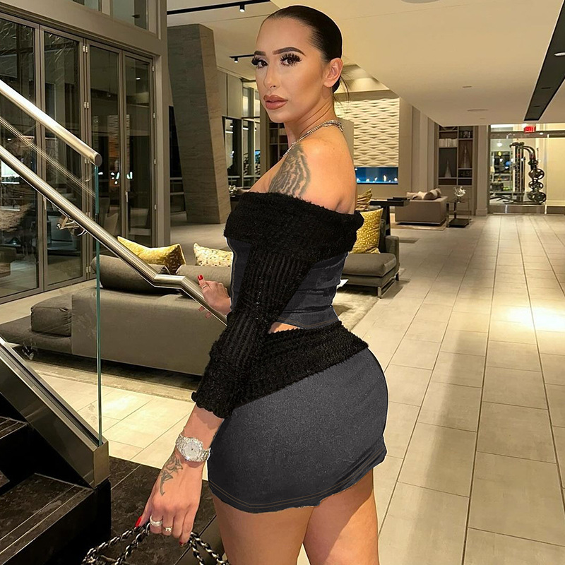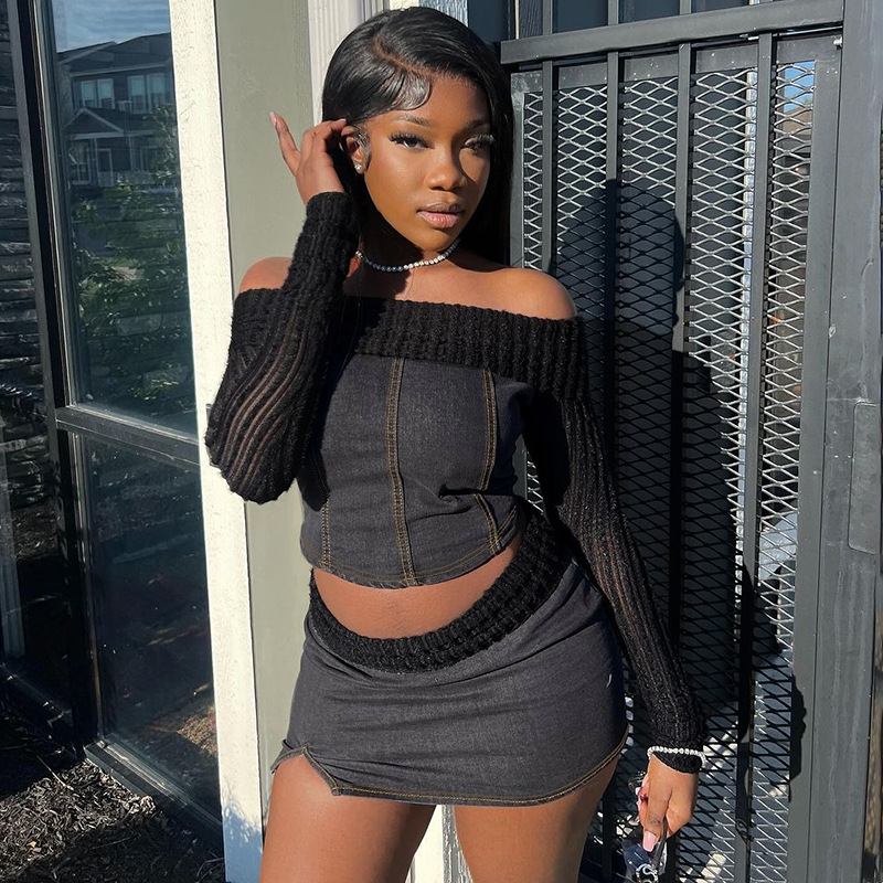 One-piece Top And Figure-hugging, Slit Mini Skirt Set
