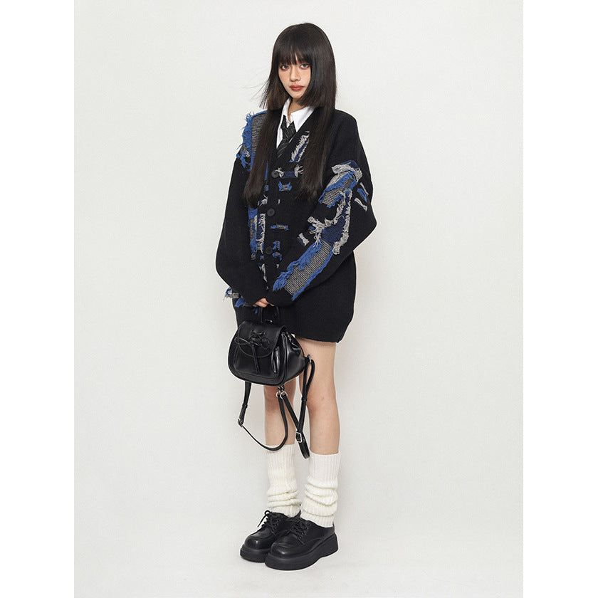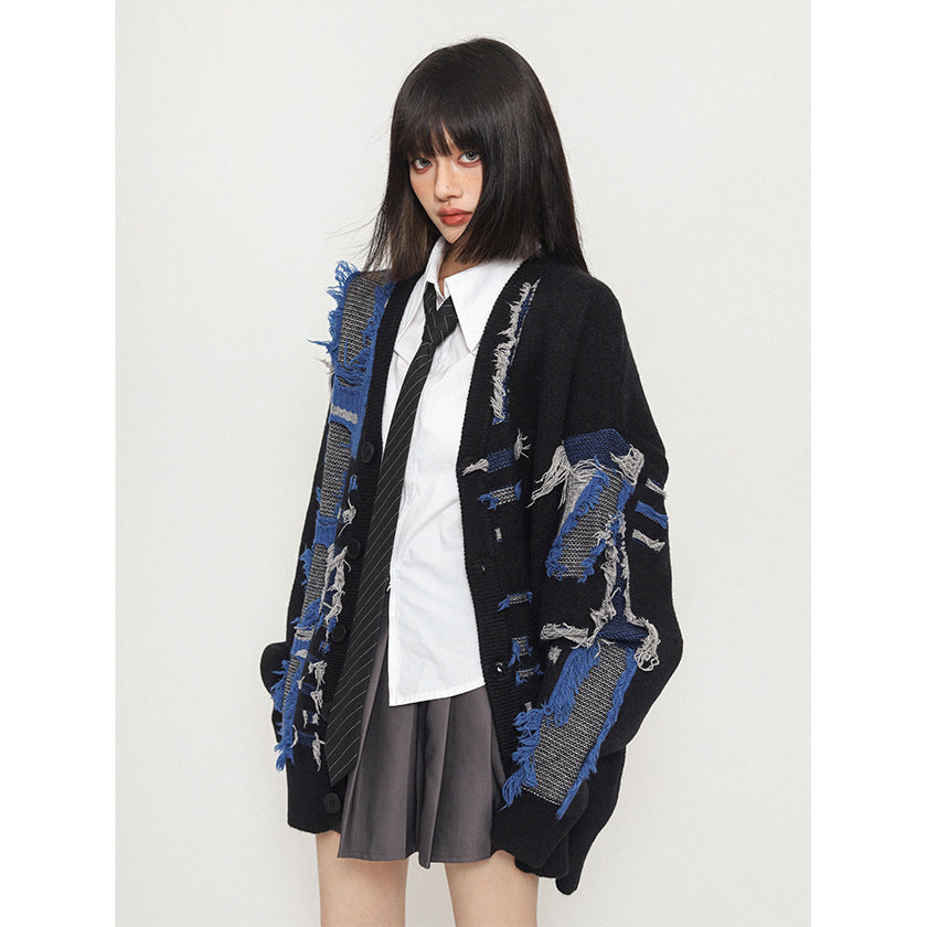 Retro Shabby Stitching Idle Style V-neck Cardigan Sweater