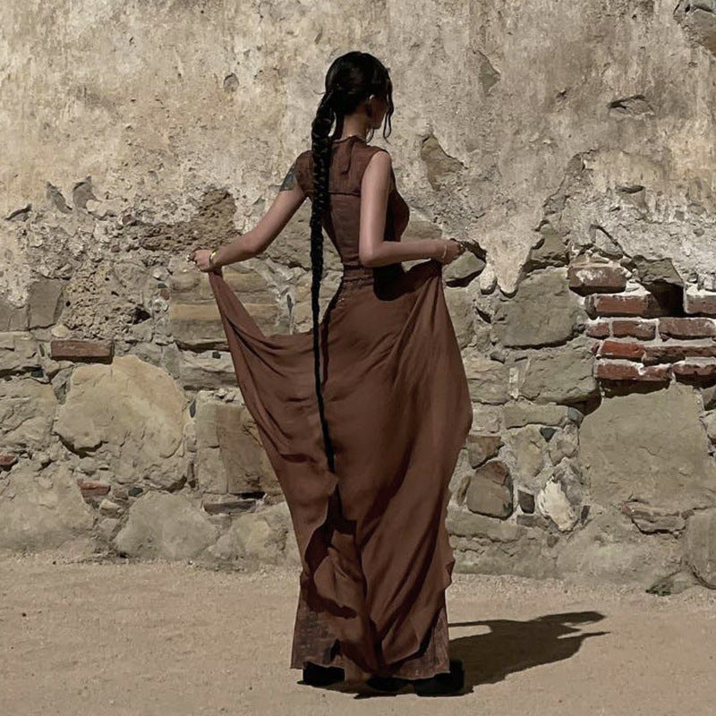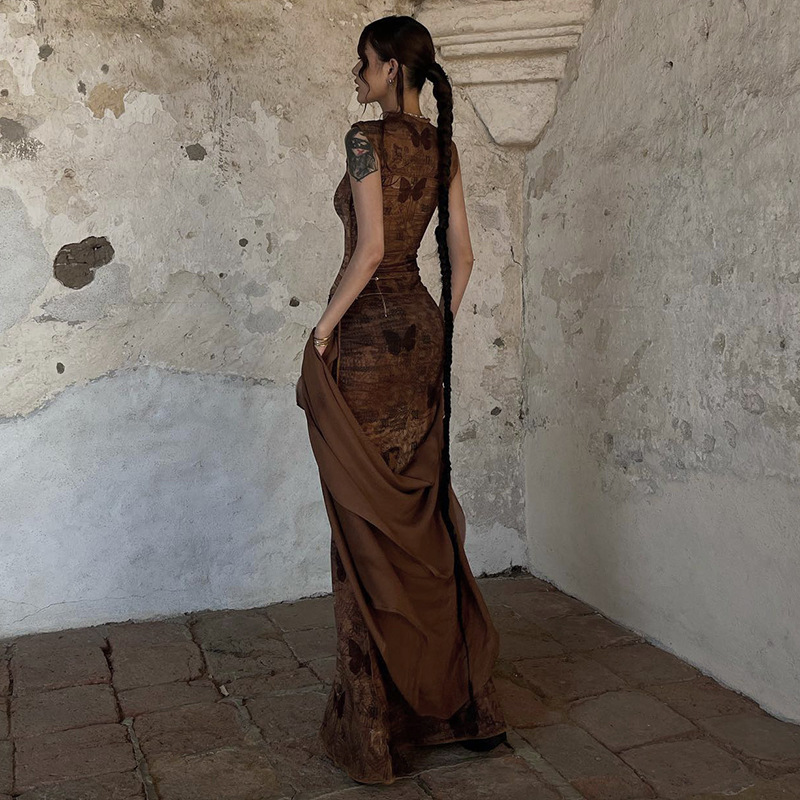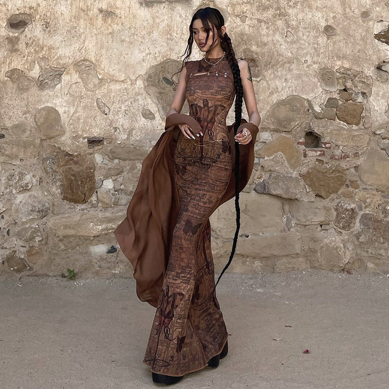 Round Neck Pullover Sleeveless Printed Hollow Dress Women