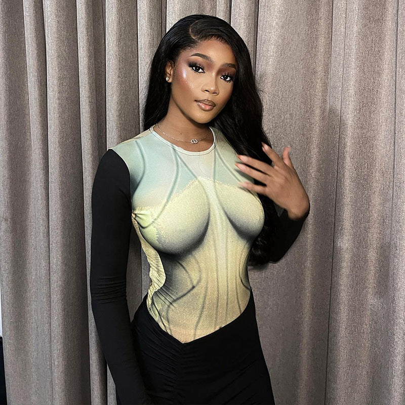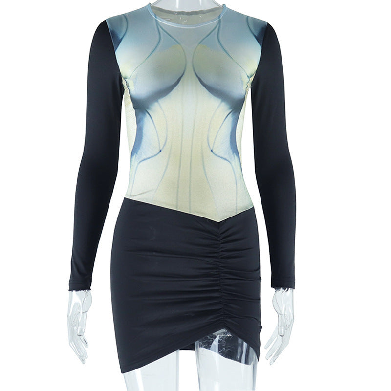 Round Neck Tight Dress Color Matching Printed Long Sleeve Pleated Pullover Skirt