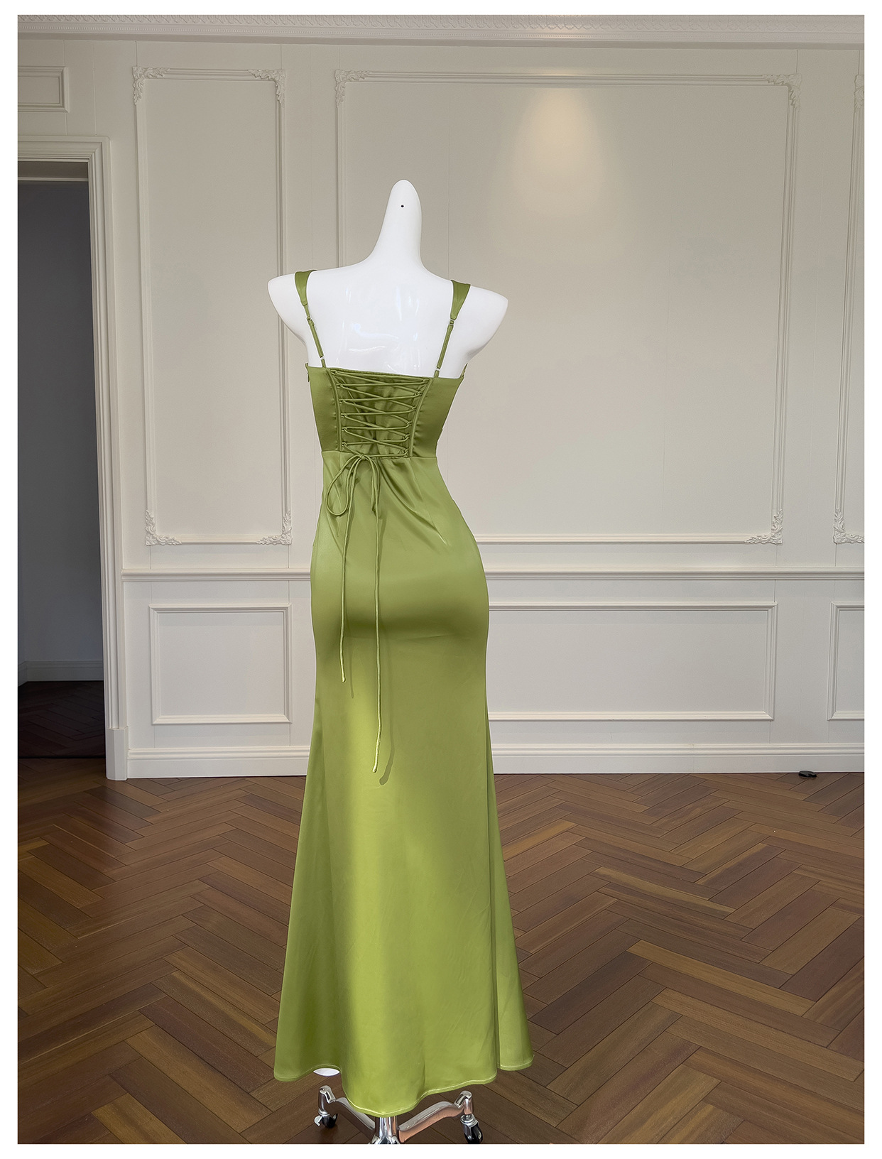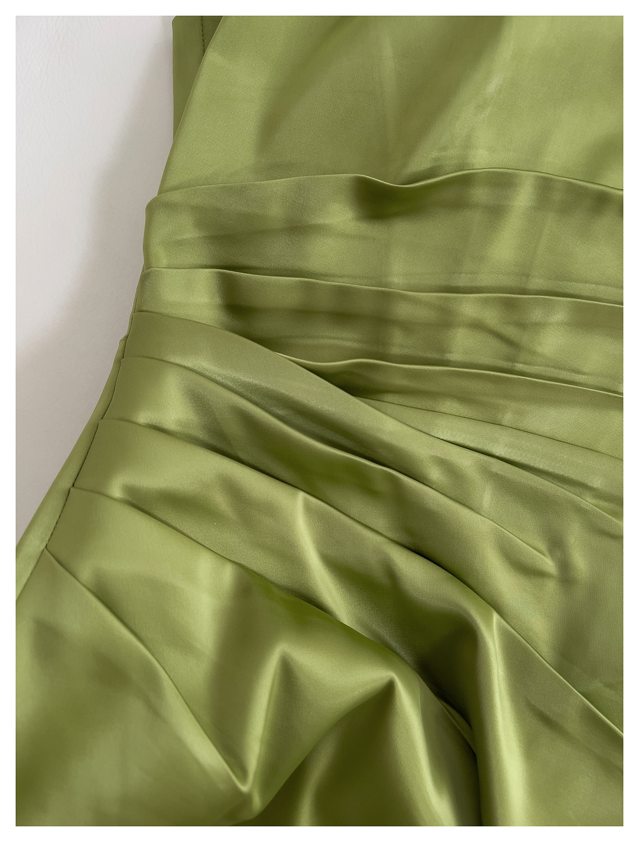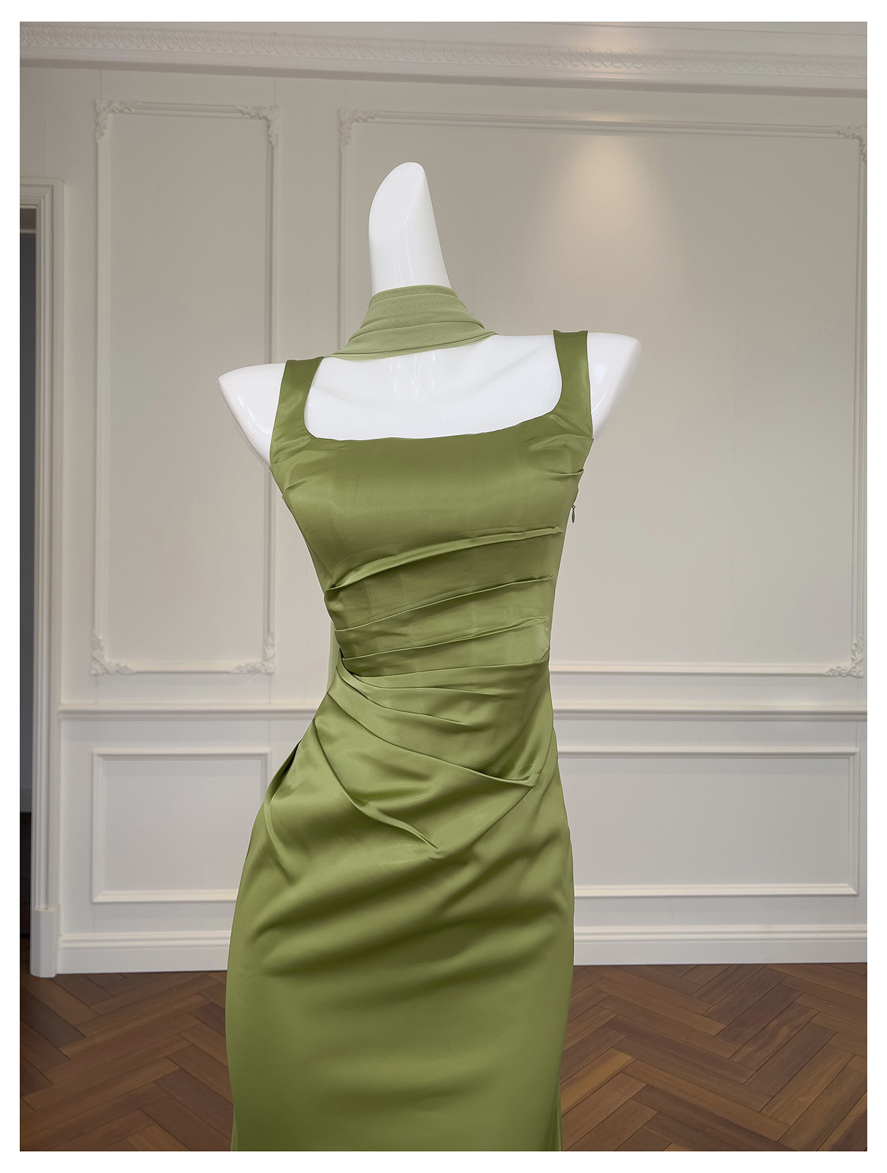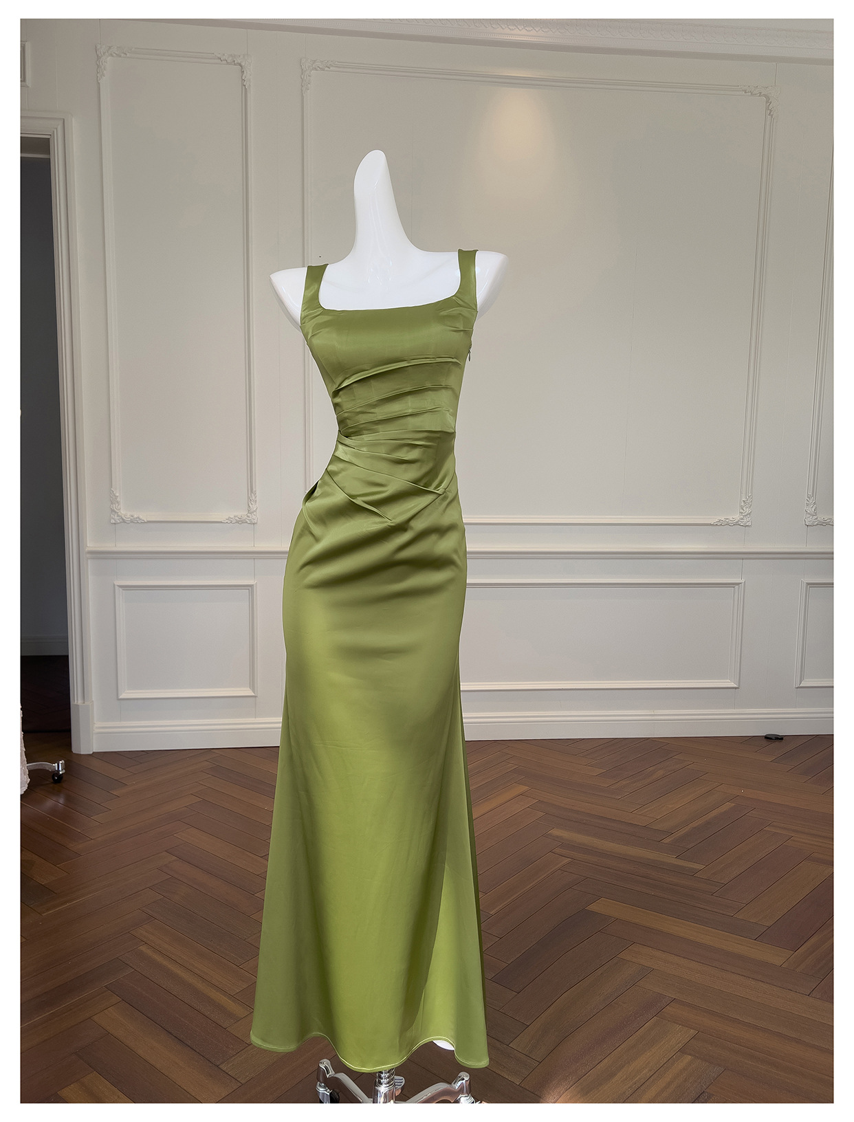 Square Collar Pleated Satin French Slim Fit Long Dress