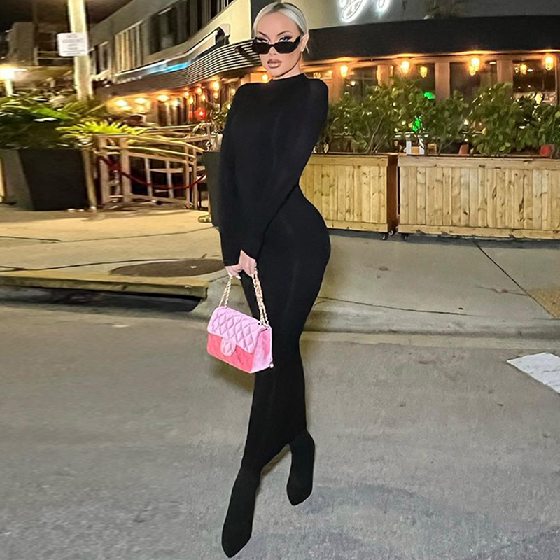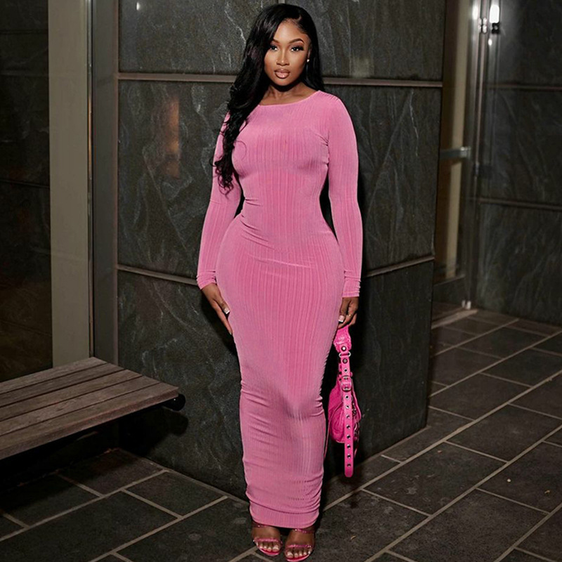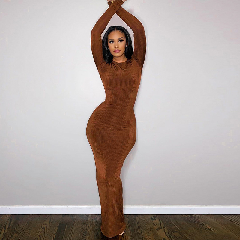 Style Fashion Solid Color Slim Fit Round Neck Long Sleeves Dress
